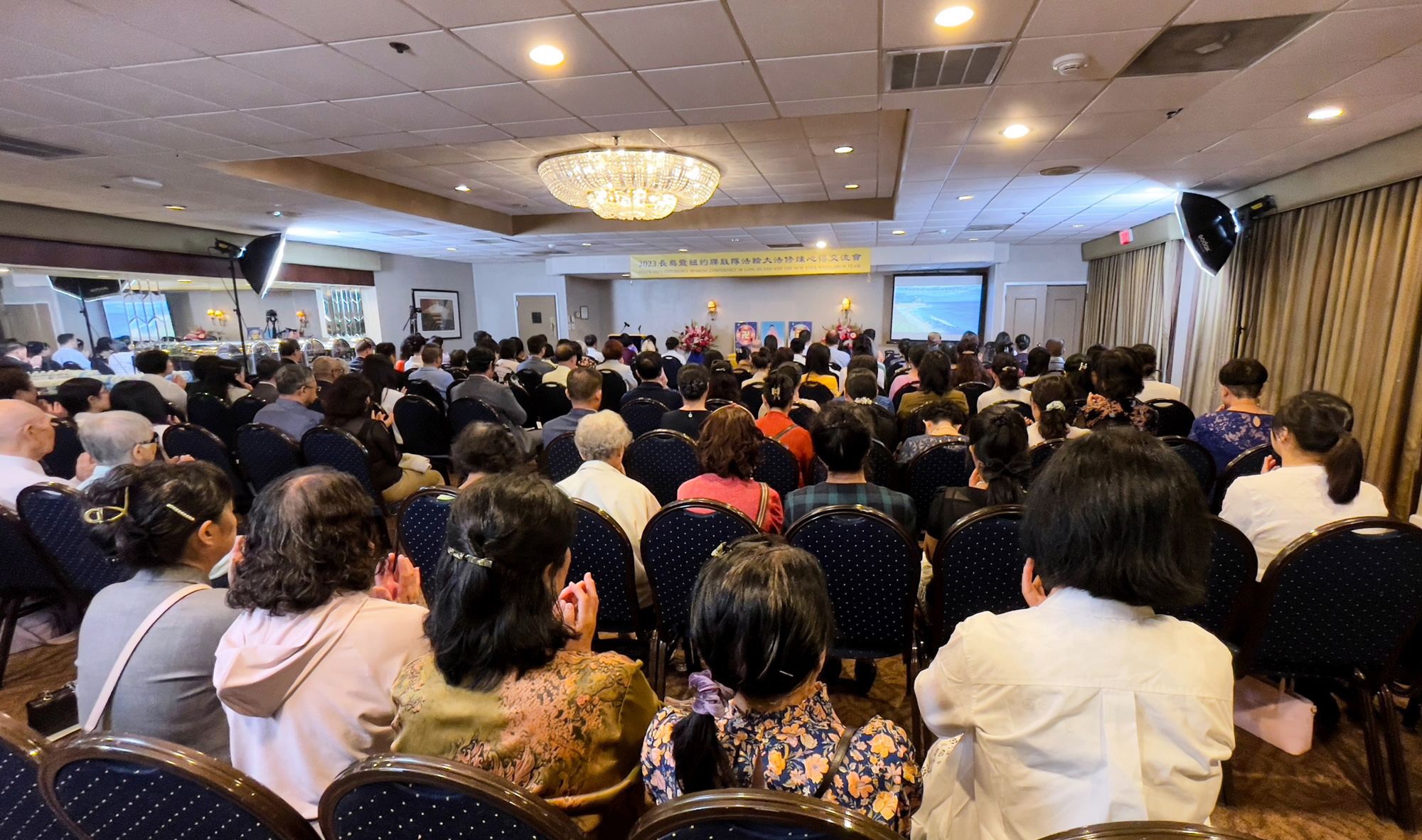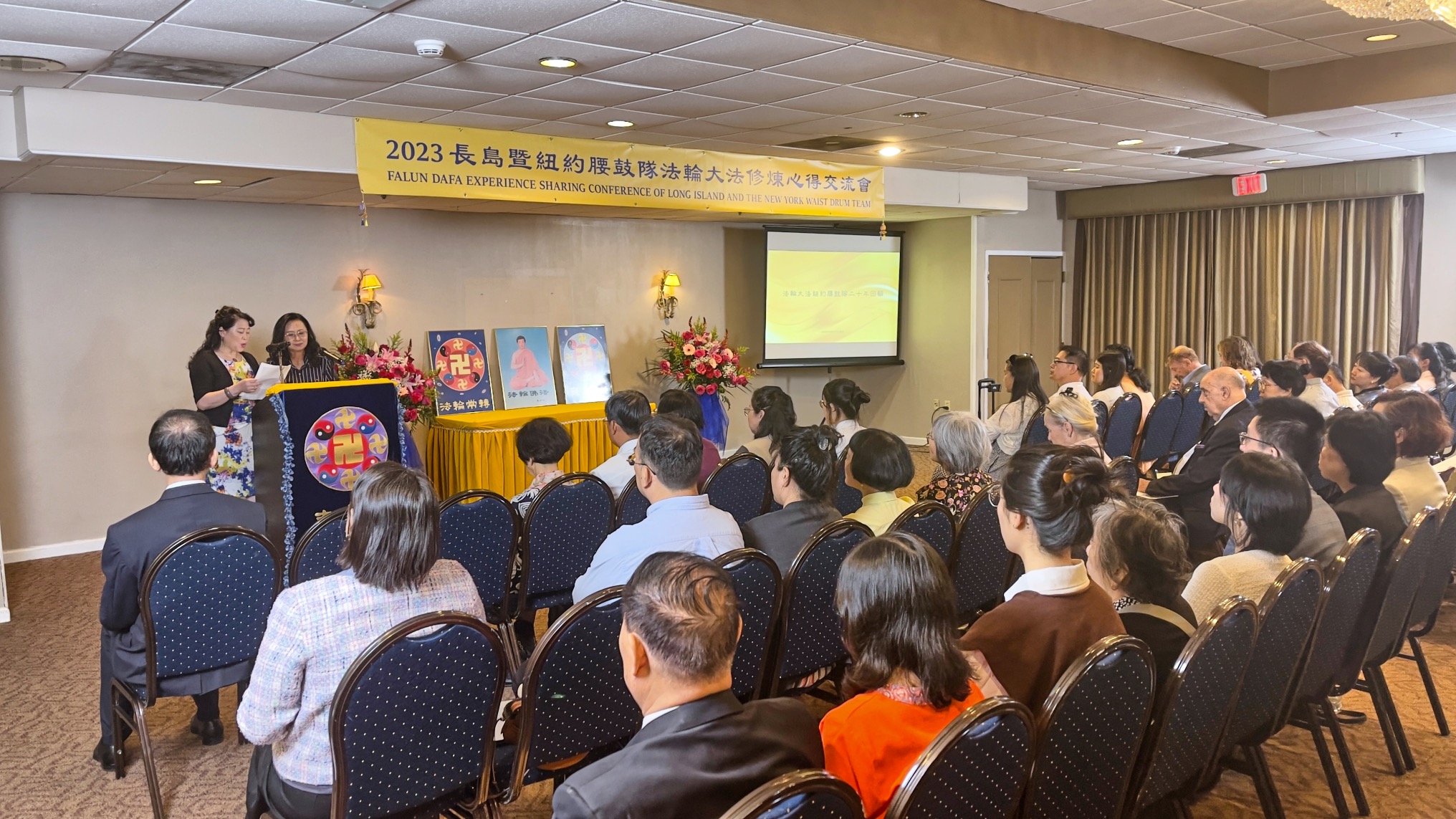 在法会会场,鲜花芬芳,师父的法像置于正中,左右两边是两幅法轮图形,上书“法轮常转”和“真善忍”。在法会开始时,播放了长岛法轮功学员在公园、社区炼功及参加各种活动弘扬大法的视频,一帧帧图片、一个个镜头,记录着大法弟子长年坚持不懈、无论严寒酷暑,救度众生的努力。