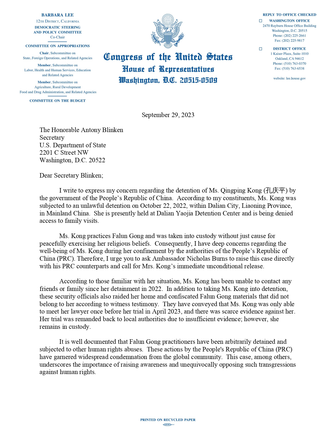 孔庆平修炼法轮功。她因和平实践她的信仰被无理拘留。我对孔女士在被中共当局监禁期间的健康状况深表关切。因此,我敦促您要求美国驻中国大使尼古拉斯·伯恩斯(Nicholas Burns)直接向中国同行提出此案,并呼吁立即无条件释放孔庆平女士。