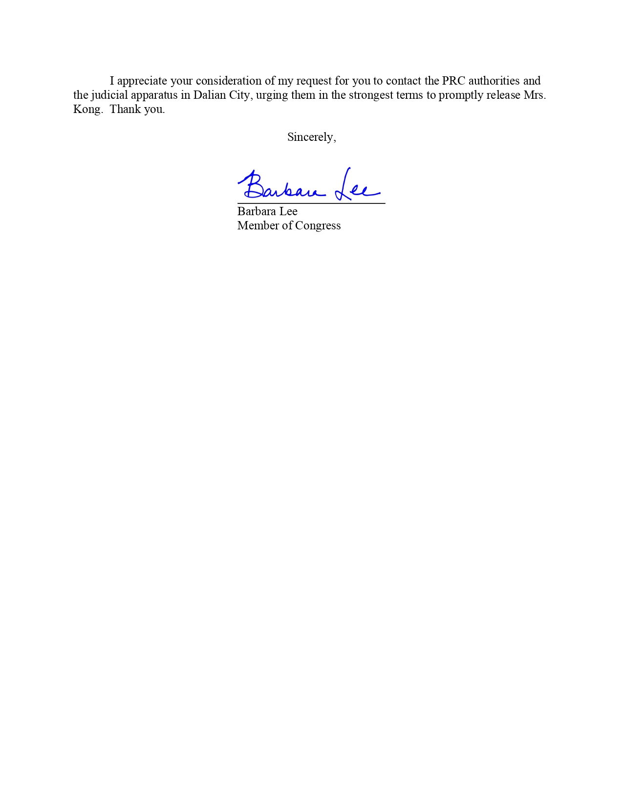感谢您考虑我的请求。请您与中共当局和大连市司法机构联系,以最强烈的措辞要求他们立即释放孔庆平女士。谢谢。