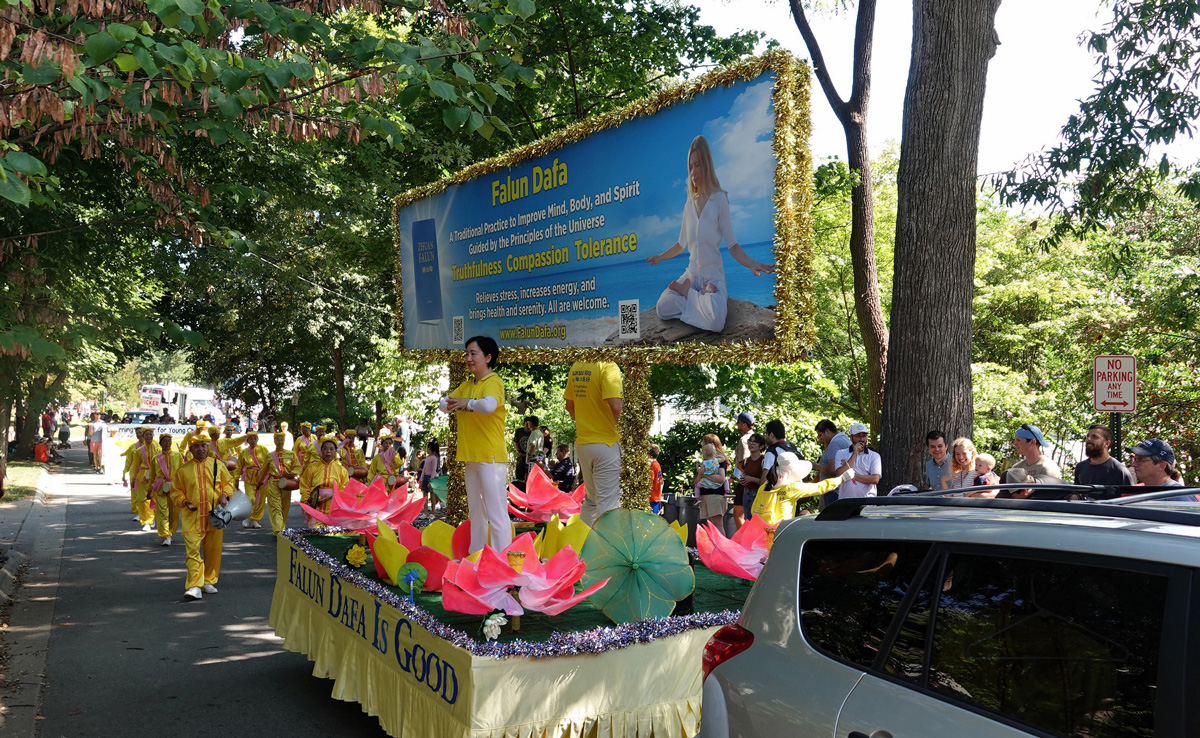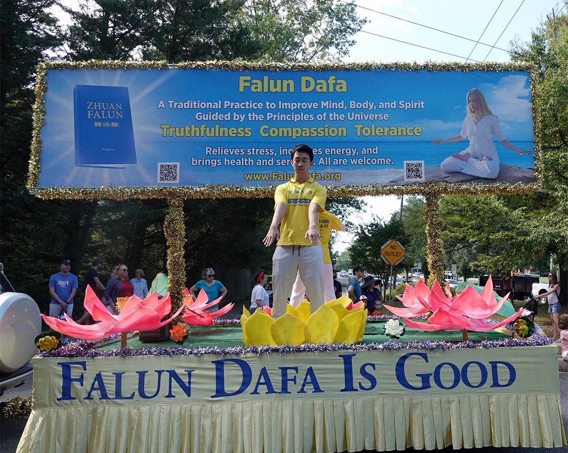法轮功学员手持写有“法轮大法”、“世界需要真善忍”的横幅,并在花车上演示法轮功五套功法。