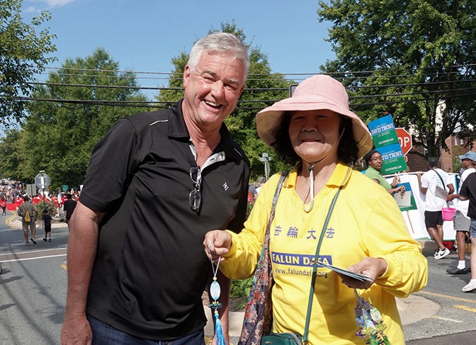 美国马里兰州联邦众议员戴维·特隆(David Trone)也来参加游行,他接过法轮功学员递给他的真相传单和精美的小莲花。特隆议员多次给法轮功颁发褒奖,感谢法轮功学员通过分享真善忍核心价值,对社区做出宝贵的贡献。他认为,这对于建立一个更强大的社区至关重要。