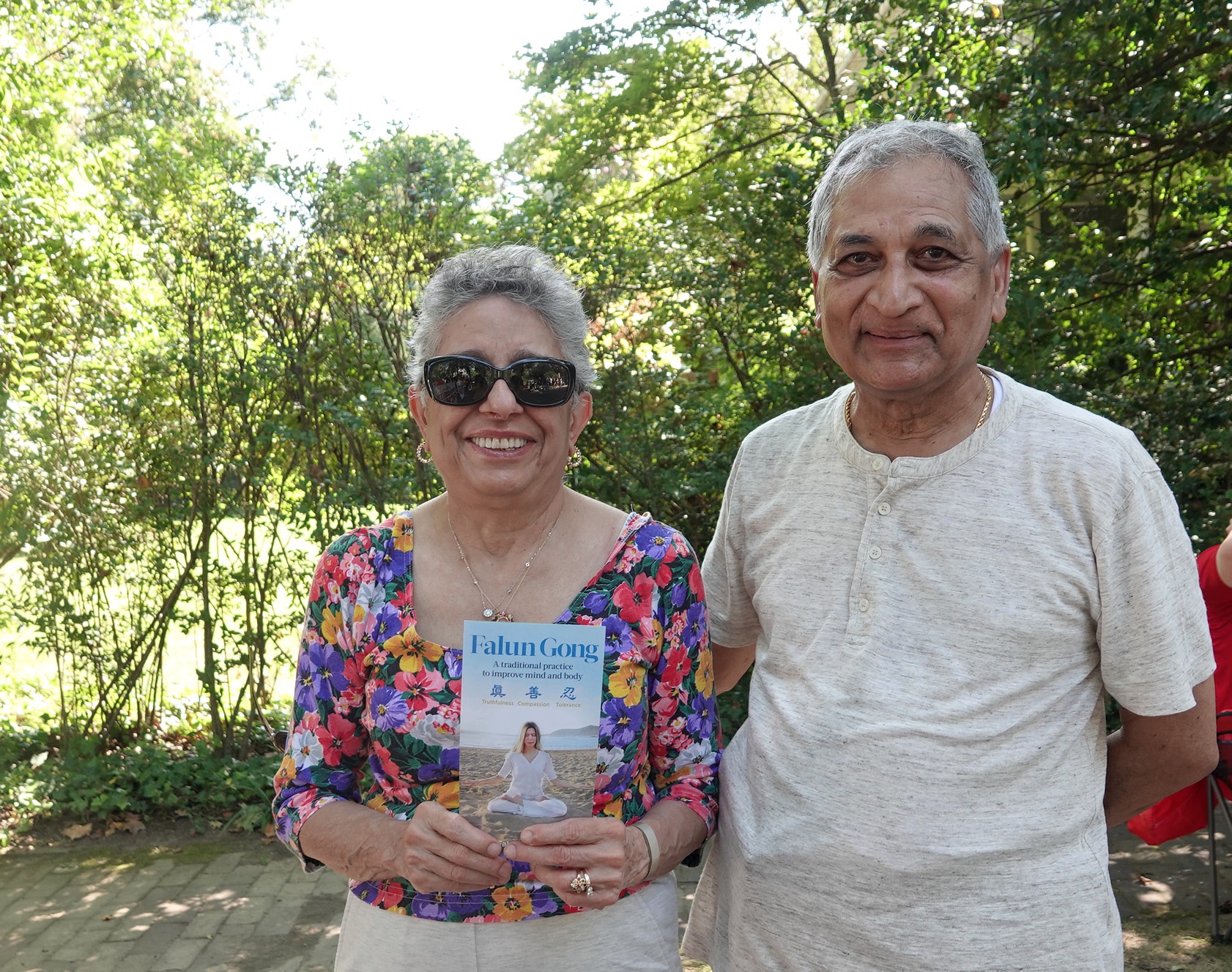 印度裔夫妇古普塔(Gupta)和米娜(Mina)说,他们的外孙女参加游行,他们专程从马里兰州巴尔的摩郡赶到女儿家,来观看游行。在这里,他们第一次看到法轮功学员的游行队伍。花车上,两位法轮功学员演示法轮功功法,让他们产生内心的共鸣。古普塔说:“我们需要内心的平静,人们都需要让内心平静下来,大家都太忙碌了。”米娜说:“真善忍,这就是我们都需要的,非常好。”
