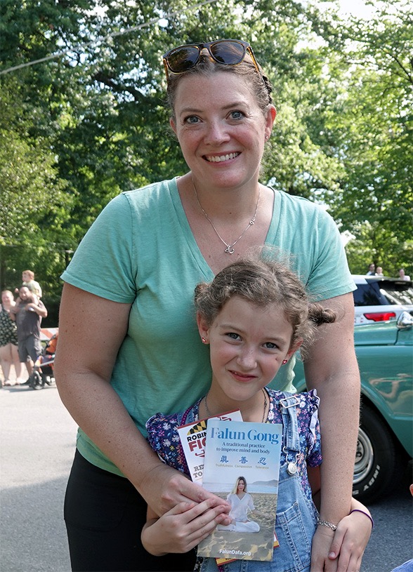 梅根(Megan)带着孩子观看游行。她和女儿专注地观看花车上的法轮功学员演示功法。梅根说:“他们看起来非常放松,很美。”她和女儿都喜欢打坐,想了解更多法轮大法的信息。