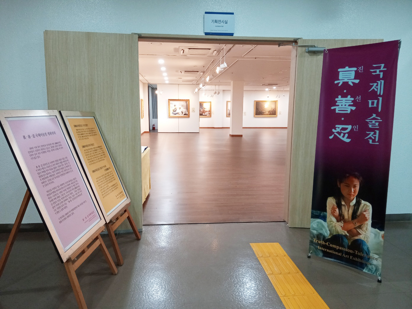 ![]() 图1:二零二三年八月七日至十二日,“真善忍国际美术展”在釜山市北区文化艺术会馆展示厅举行,图为展示厅入口。 |