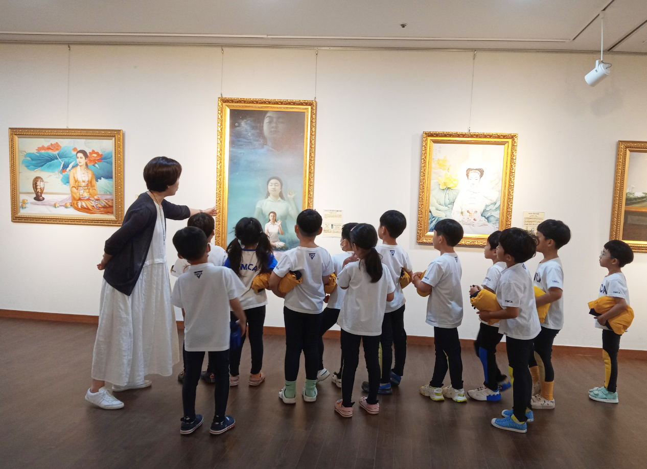 补习班学生们也组团来参观此次美术展,解说员向他们说明:“这里展出的所有作品的创作者们都是真、善、忍精神的实践者。生活中应该遵守真(真诚)、善(善良)、和忍(遇到困难也能忍耐坚持),做一个正直的人。”