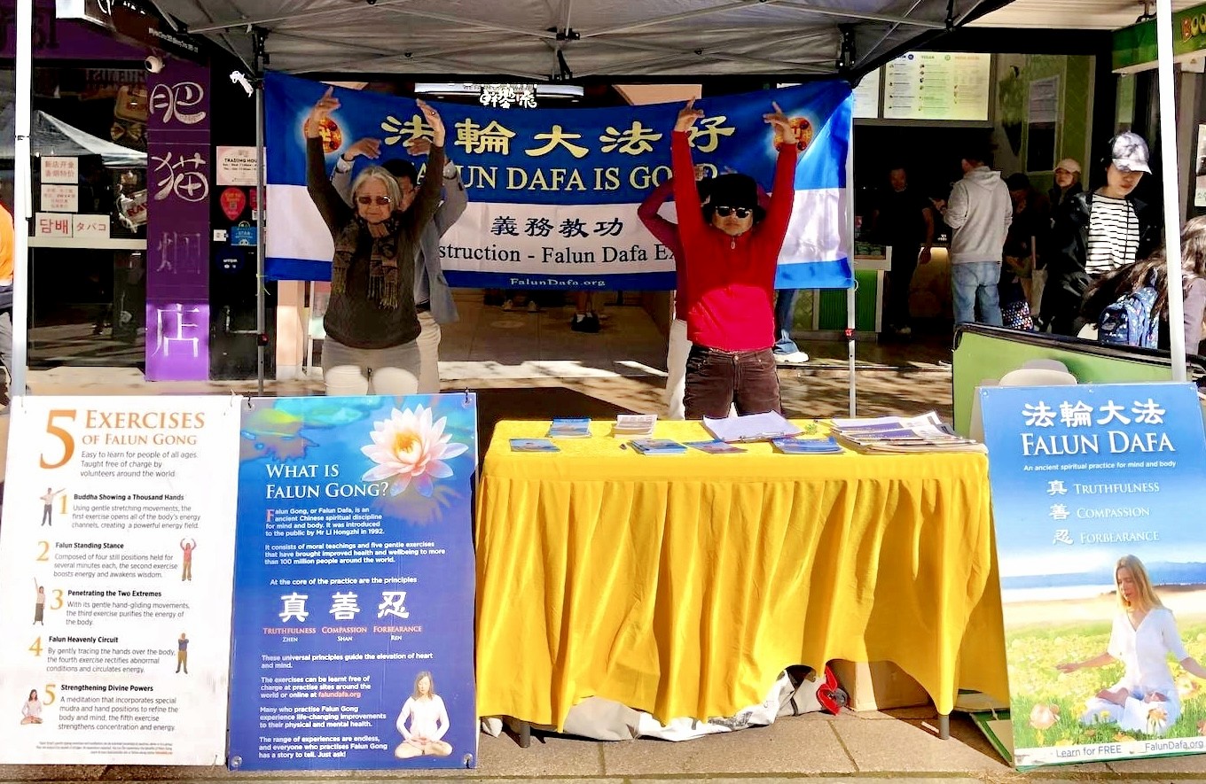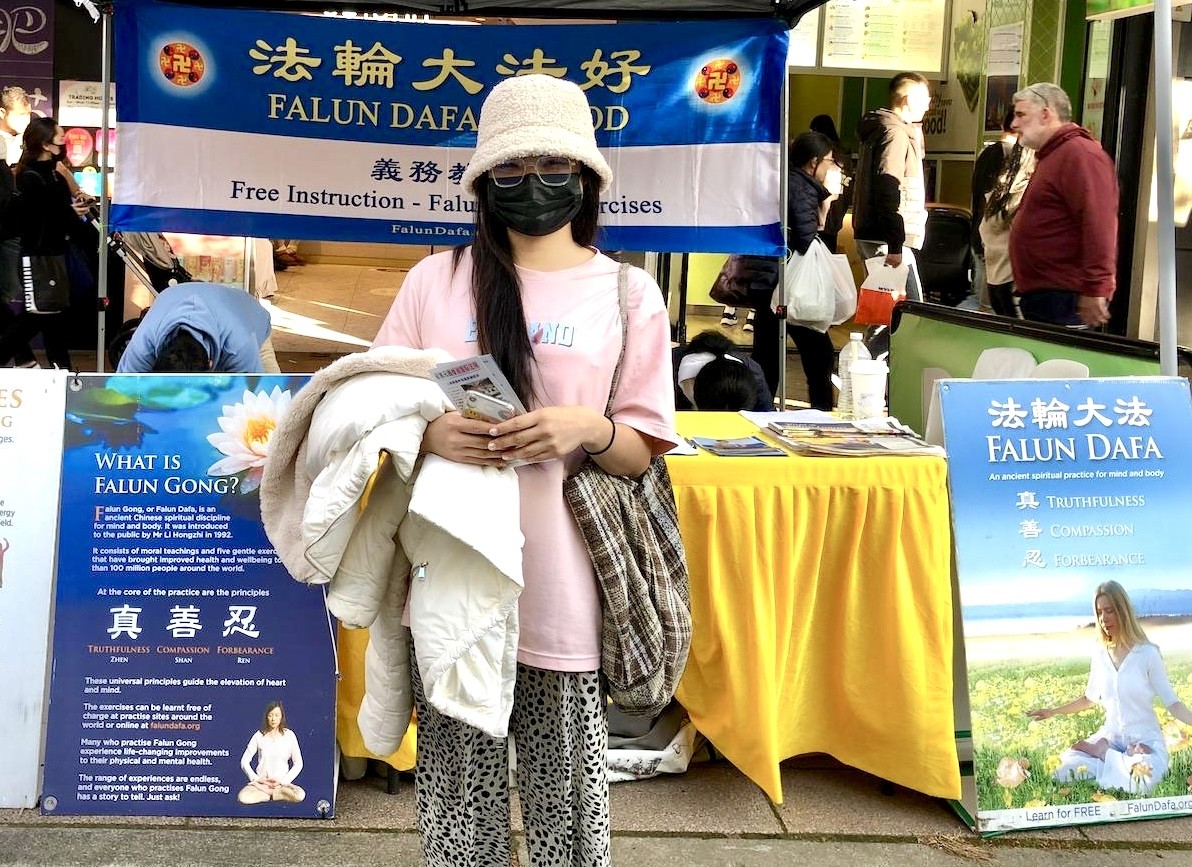 澳洲年轻女孩薇(Vee)每天早上都看到法轮功学员在车士活(Chatswood)市中心的图书馆外面炼功和打坐。当天,她一看到法轮功展位就很感兴趣,她拿了法轮功简介单张,希望把法轮功介绍给她的父亲。
