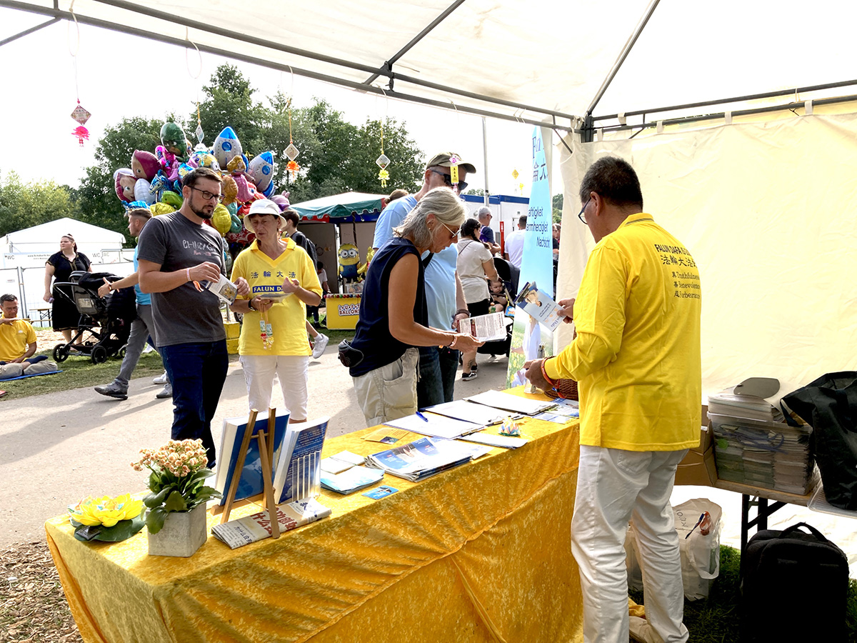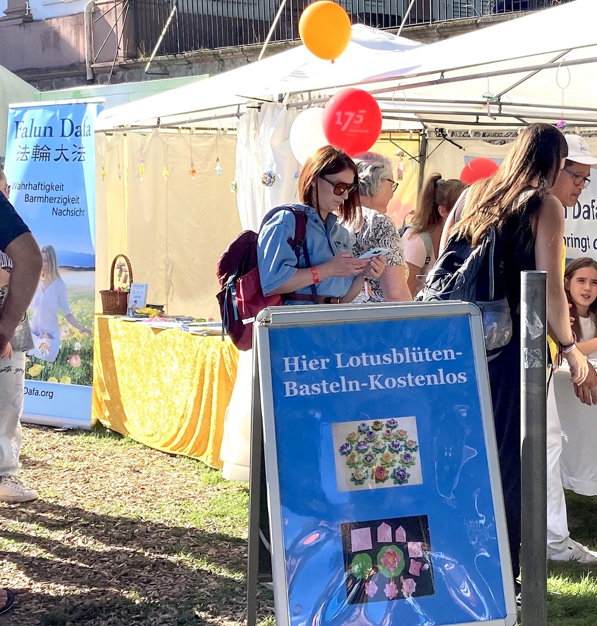 二零二三年九月二日至三日,在德国哈瑙市民节上,法轮功学员向当地民众展示了法轮功的美好,进行表演功法,并教民众手工折叠带有九字真言的莲花,让更多的有缘人结识法轮功。