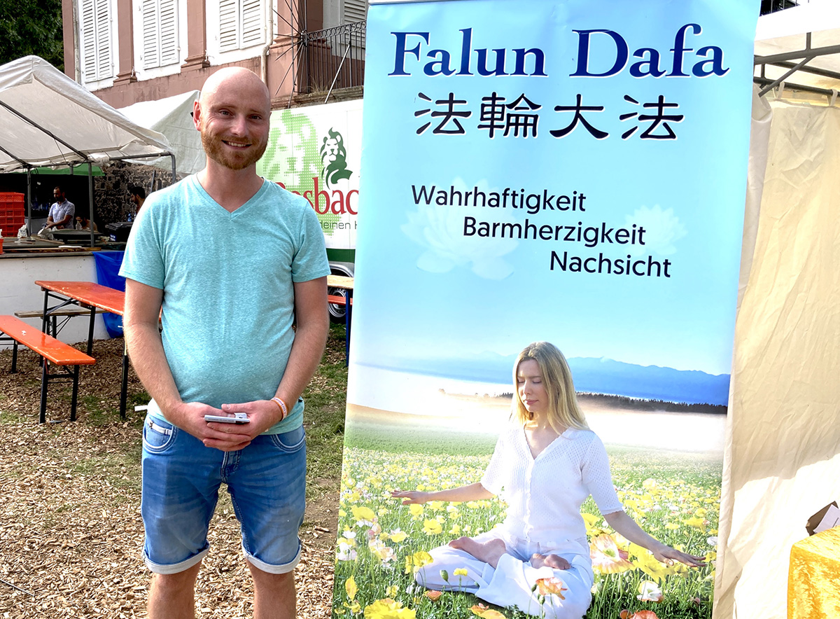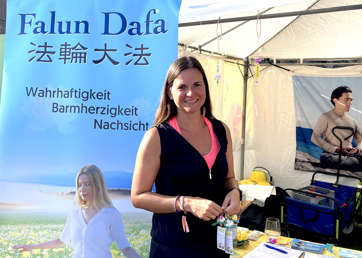 弗洛瑞安(Florian)的妻女坐在展位上学叠纸莲花,等在一旁的他拿起法轮功传单阅读起来。他对法轮功学员说:“本来我对打坐就感兴趣,横幅上学员打坐的照片和这几个字(真、善、忍)引起了我的关注。”他说自己以前就有学打坐的想法,只是还没有机会。“你们的信息可能就是我入学的门票,让我如愿以偿。”