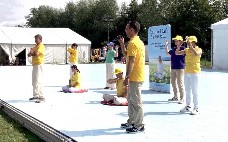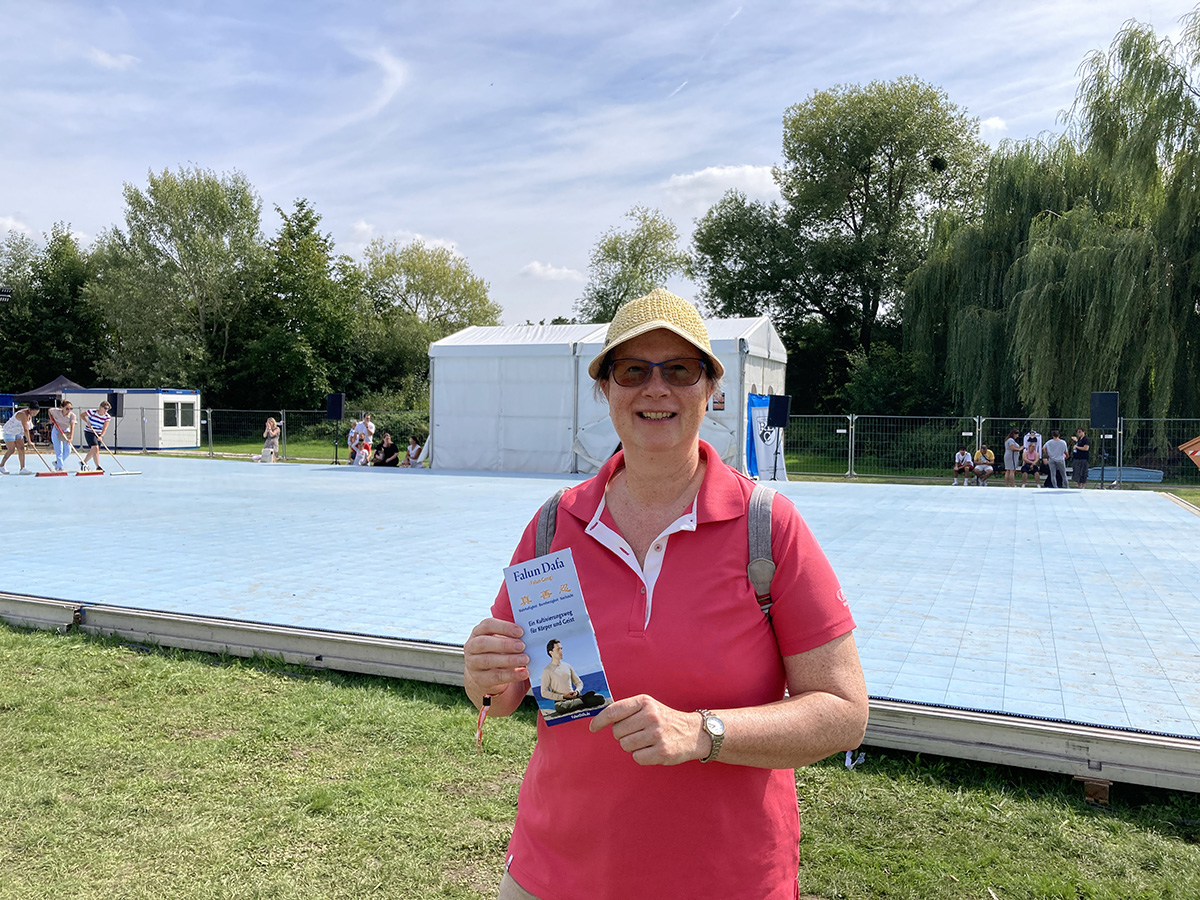 朗恩女士(Frau Lange)本来在对面的小舞台看演出,听到这边在介绍气功,就走过来观看。她上大学和工作时就尝试过气功,希望能通过气功让自己静下来。第一和第四套功法的动作她一看就觉得自己也很想学,她说:“炼功动作很祥和。台上演示的其中那两套功法,我看我也能行。”