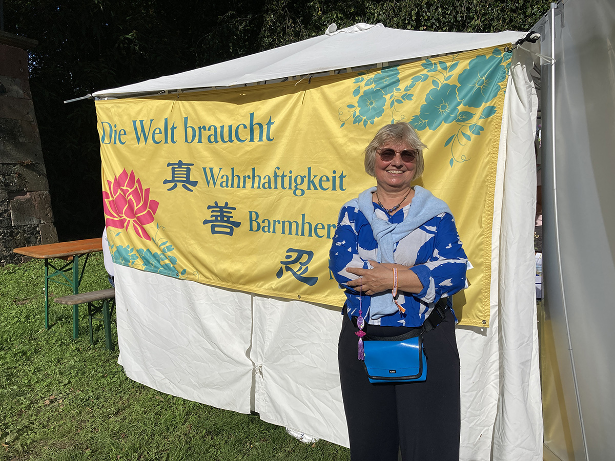 弗黎德丽可·桑莫(Friedrike Sommer)以前在法兰克福就了解过法轮功,今天看到信息台就和朋友一起走过来,想了解最新情况,并签名抵制中共迫害。她认为真、善、忍的价值观很美好,对人类很重要。她说:“没有真,根本就不行。我们也需要善,很重要,还有忍。这些都非常有智慧。”