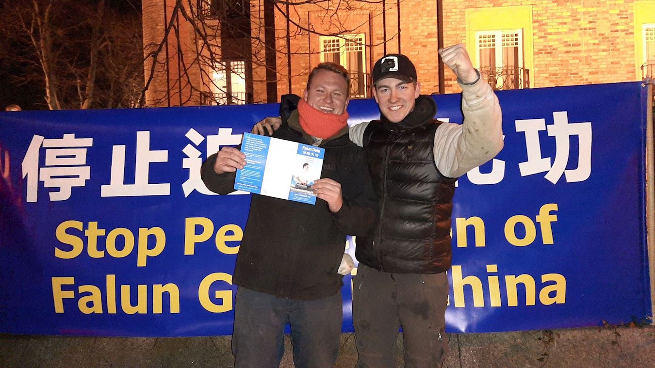 ![]() 图3:两位德国小伙表示支持学员反迫害 |