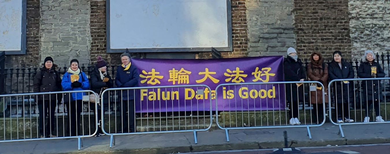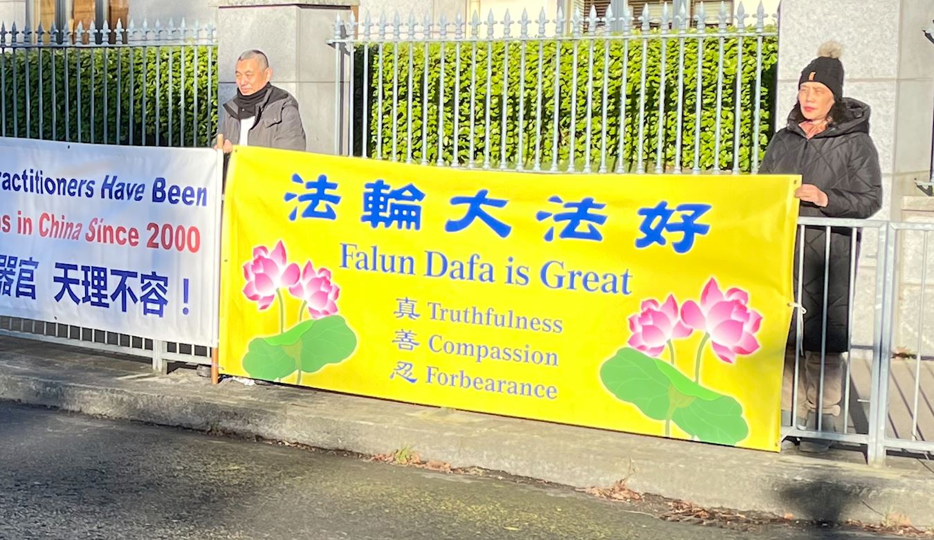 在李强访问期间,法轮功学员一直在首府都柏林和平请愿,告诉世人法轮大法好,同时揭露中共对法轮功学员长达二十四年多的迫害。过往车辆向学员鸣笛表示支持,也有司机特意打开车窗,对学员竖起大拇指。也有行人在了解真相后与学员一一握手表示支持。