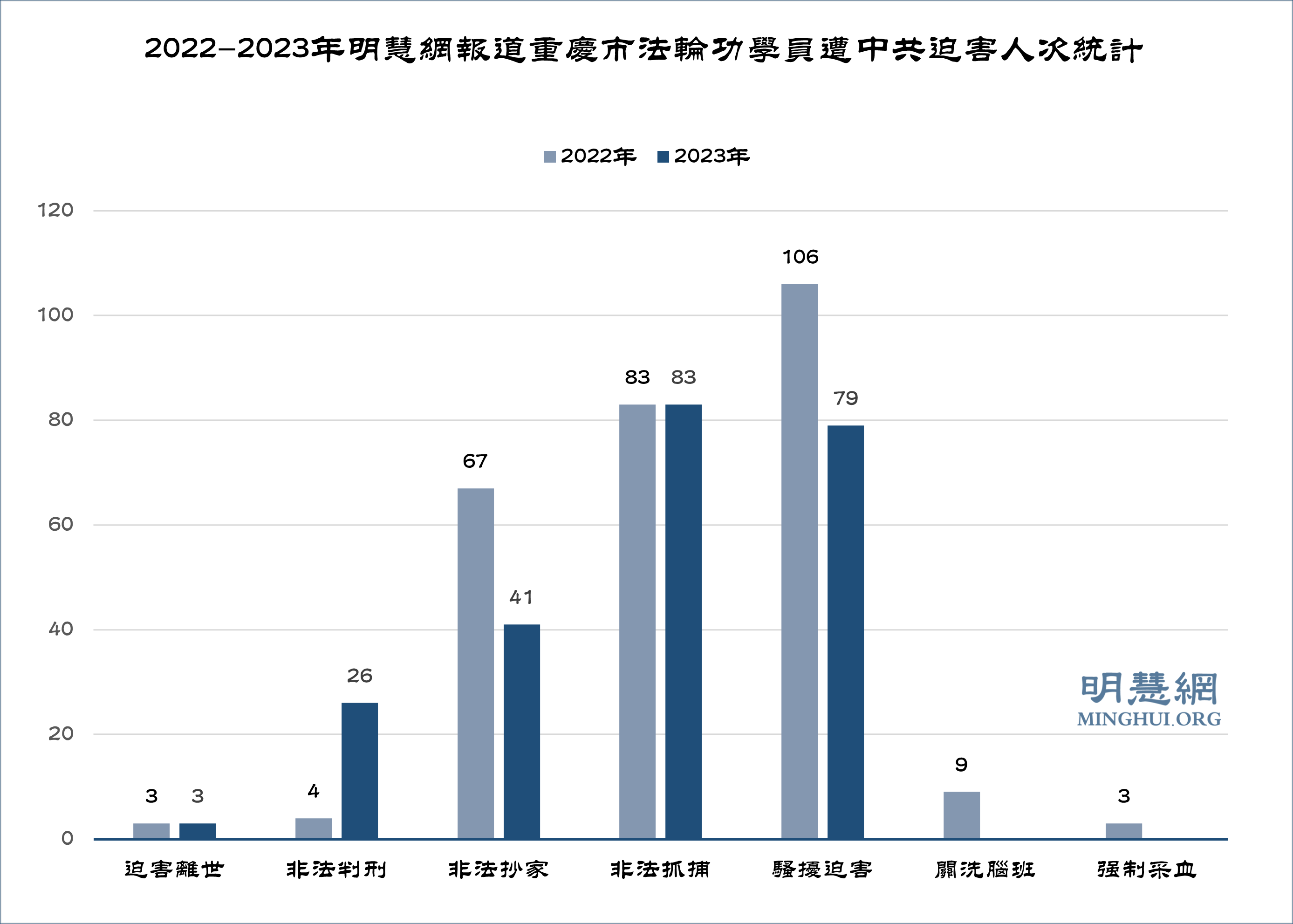 ![]() 图1:2022-2023年明慧网报道重庆市法轮功学员遭中共迫害人次统计 |