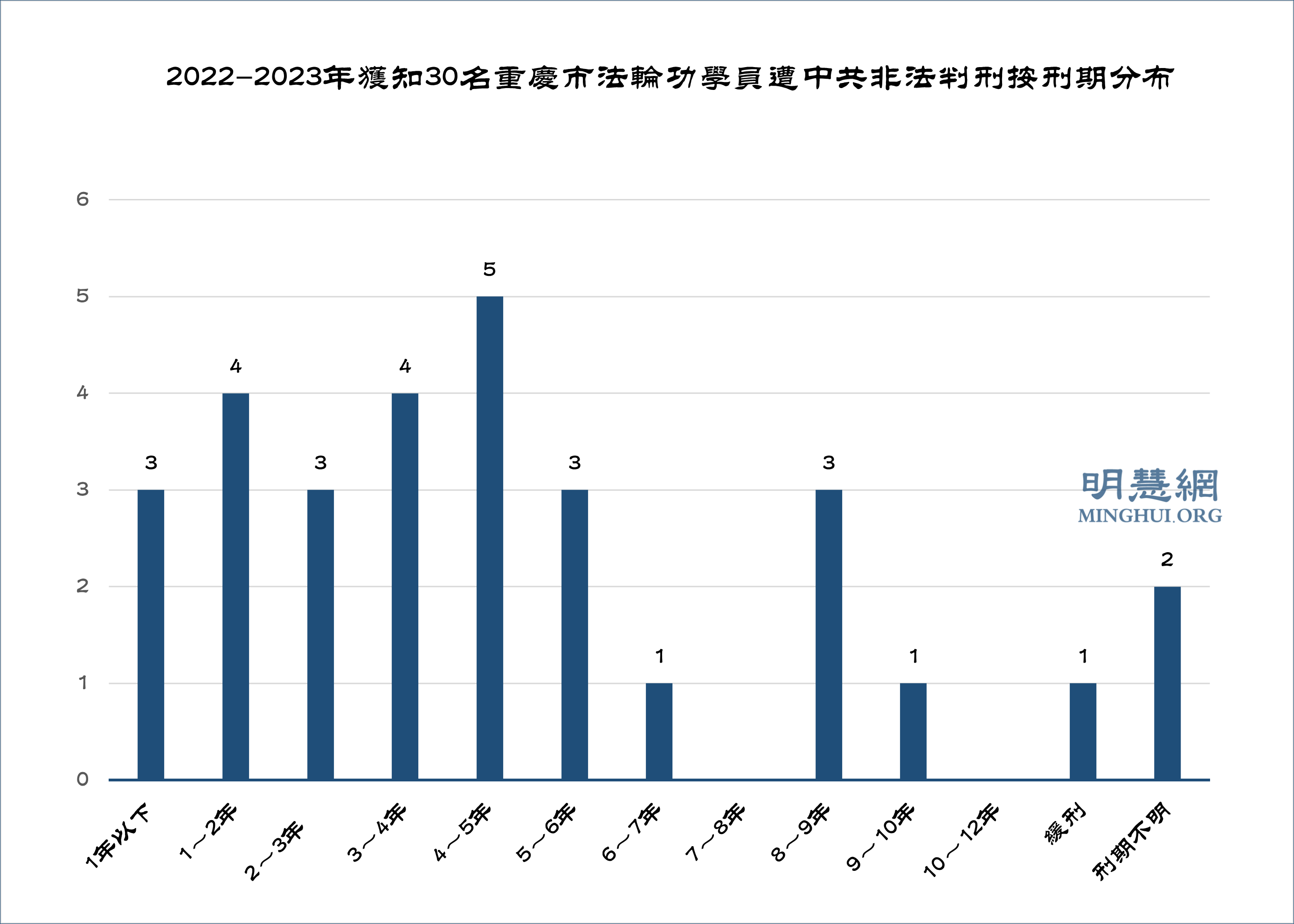![]() 图2:2022-2023年获知30名重庆市法轮功学员遭中共非法判刑按刑期分布 |