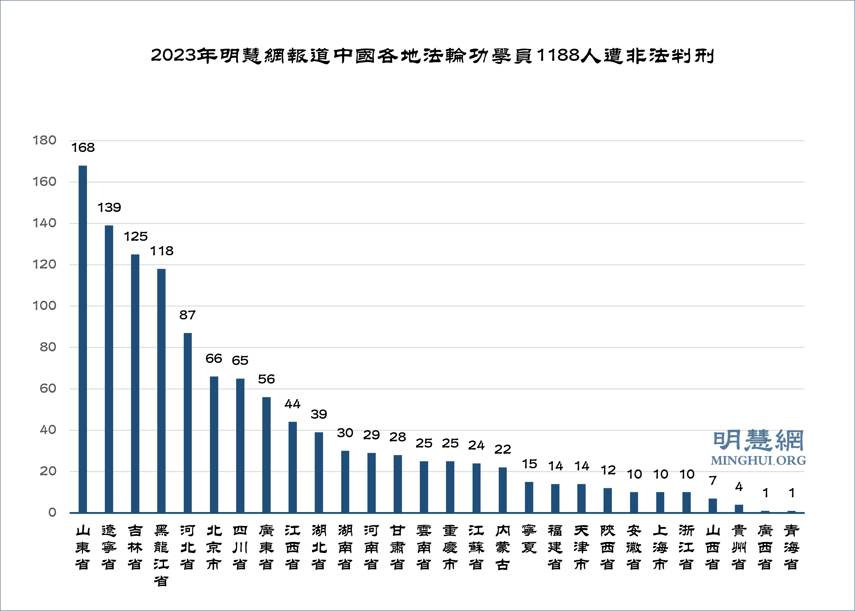 ![]() 图2:2023年明慧网报道中国各地法轮功学员1188人遭非法判刑 |