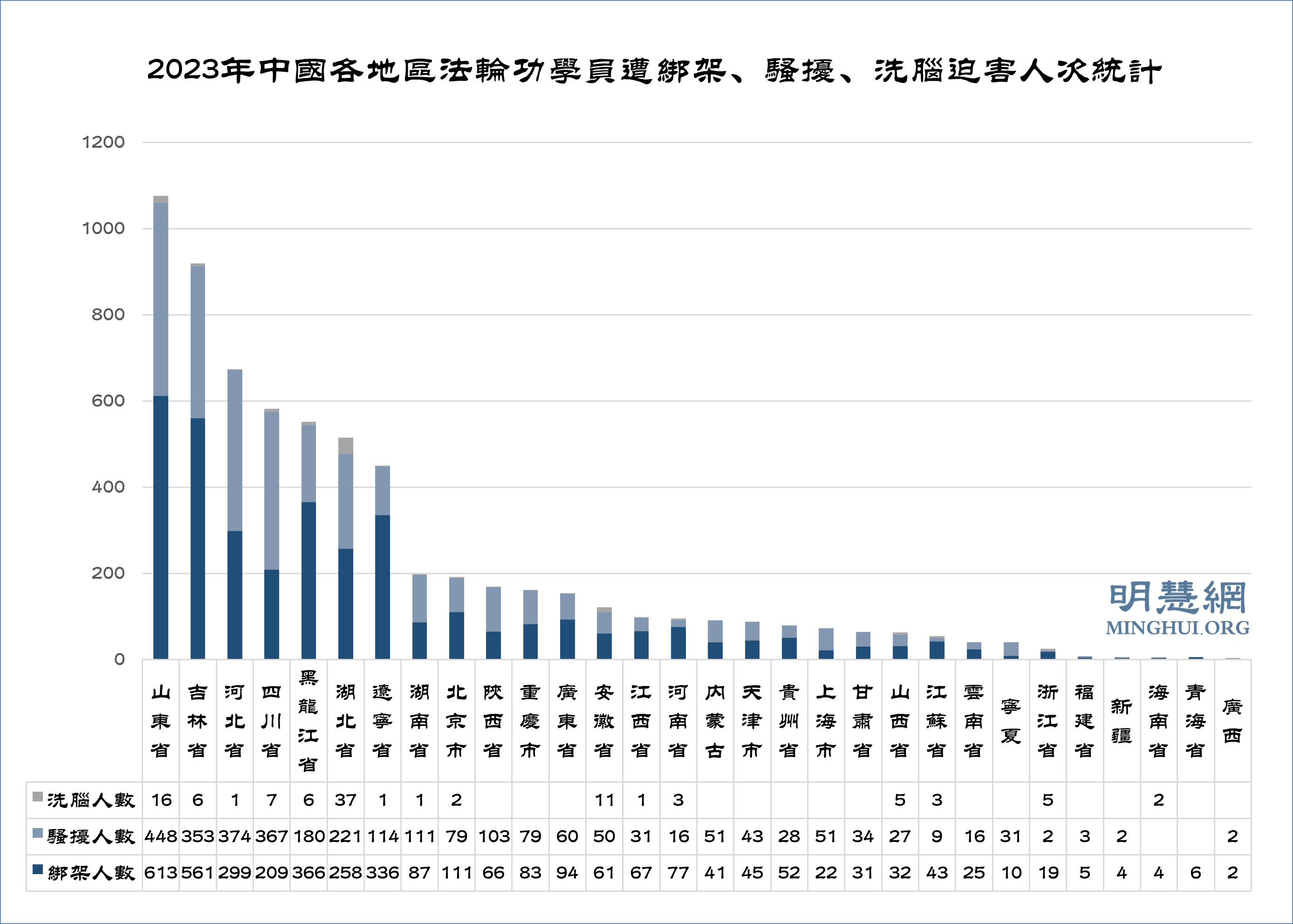 图3:2023年中国各地区法轮功学员遭绑架、骚扰、洗脑迫害人次统计
