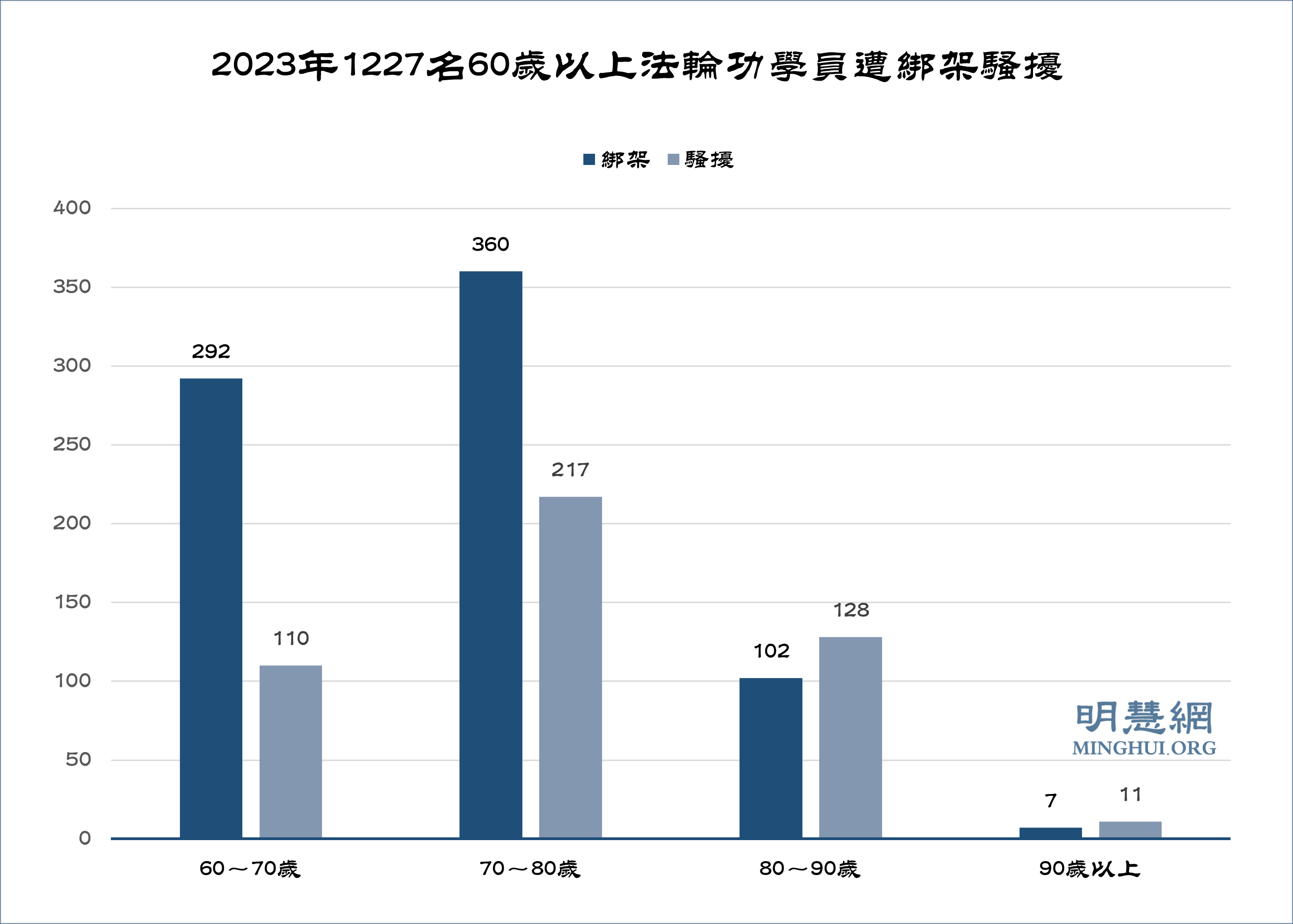 据明慧网报道统计,二零二三年上半年获知有1227名60岁以上老年法轮功学员被绑架、骚扰等迫害。其中,绑架761人,90~100岁7人,80~90岁102人,70~80岁360人,60~70岁292人。骚扰466人,90~100岁11人,80~90岁128人,70~80岁217人,60~70岁110人。13名60岁以上老年法轮功学员被迫离家出走。