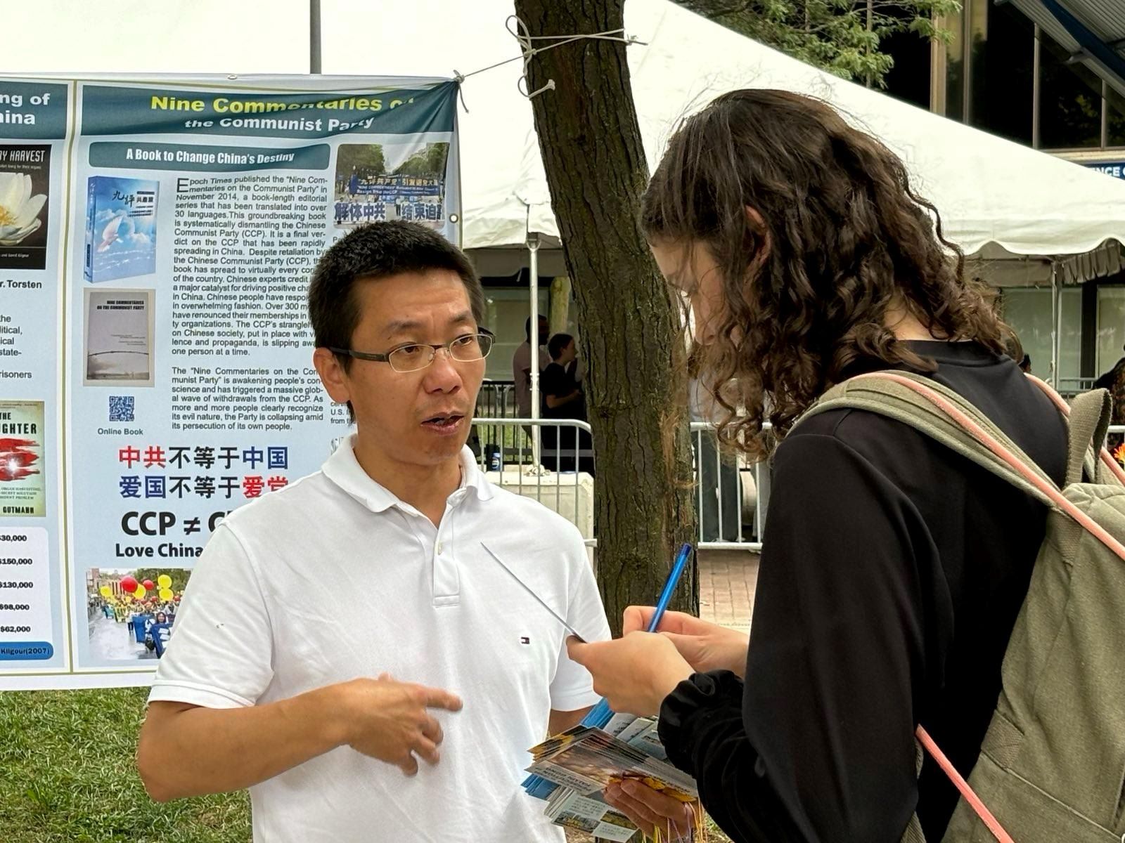 这时,一位年轻人对学员说:“你知道吗?几年前,我曾在网站上发表过一些批评中国共产党的文字,随后我收到了中国政府发给我的一封邮件,要求我立刻删除这些文字,我拒绝了。结果他们告诉我,我以后将被拒绝入境中国,成为不受欢迎的人。”他说完后,对身边签名的朋友说:“你今天签了这个名,有可能也会成为不受中共欢迎的人。”那位朋友笑着说:“那太好了!”
