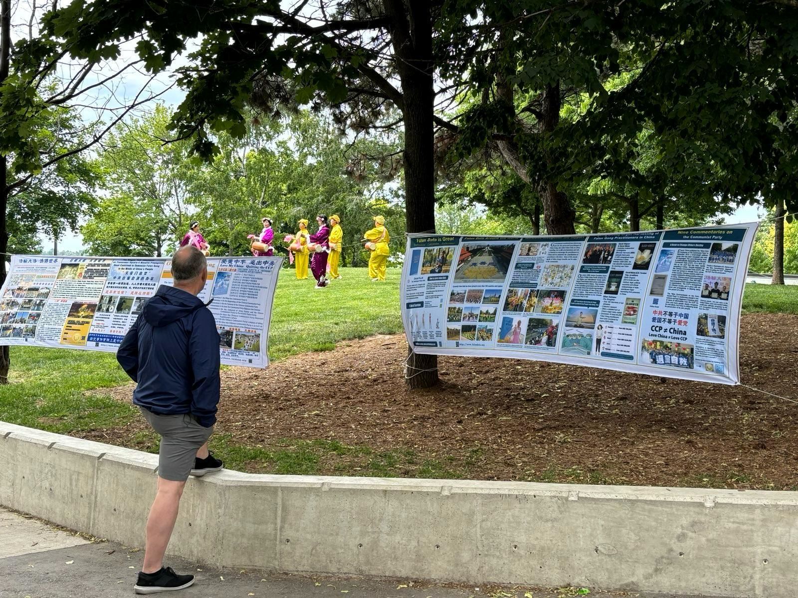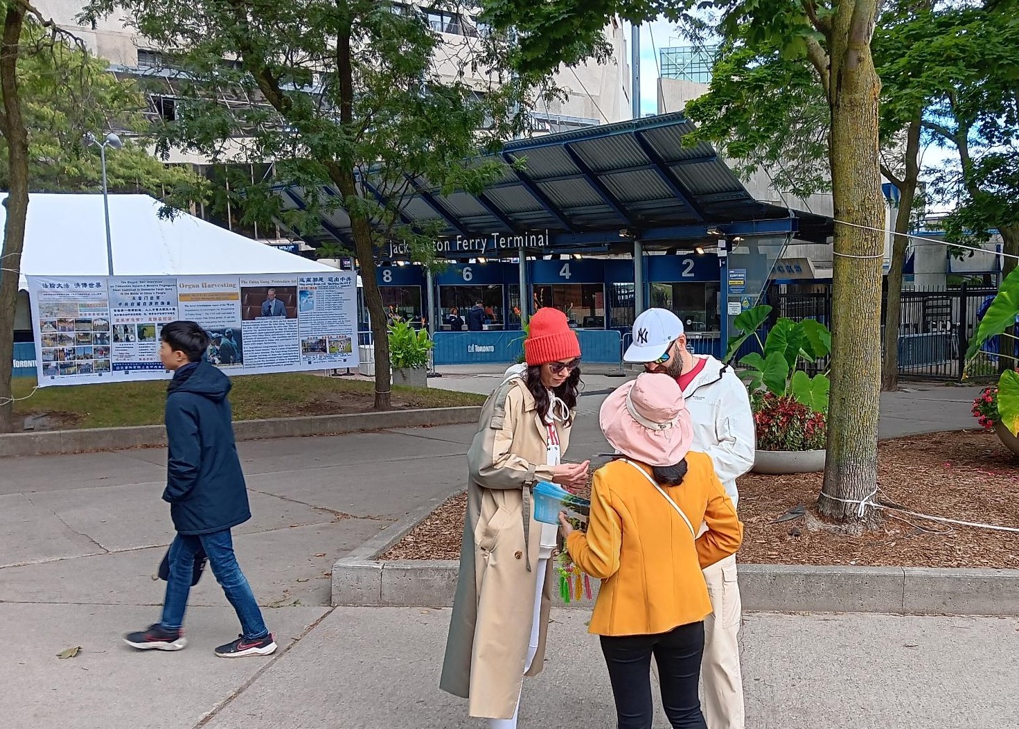 一群年轻的华人在下船后经过公园真相点,他们看了真相横幅后,很快其中一位年轻人说:“活摘器官,这有可能是真的。”学员听到是华人,便立刻走到他们面前,并开始向他们讲真相。