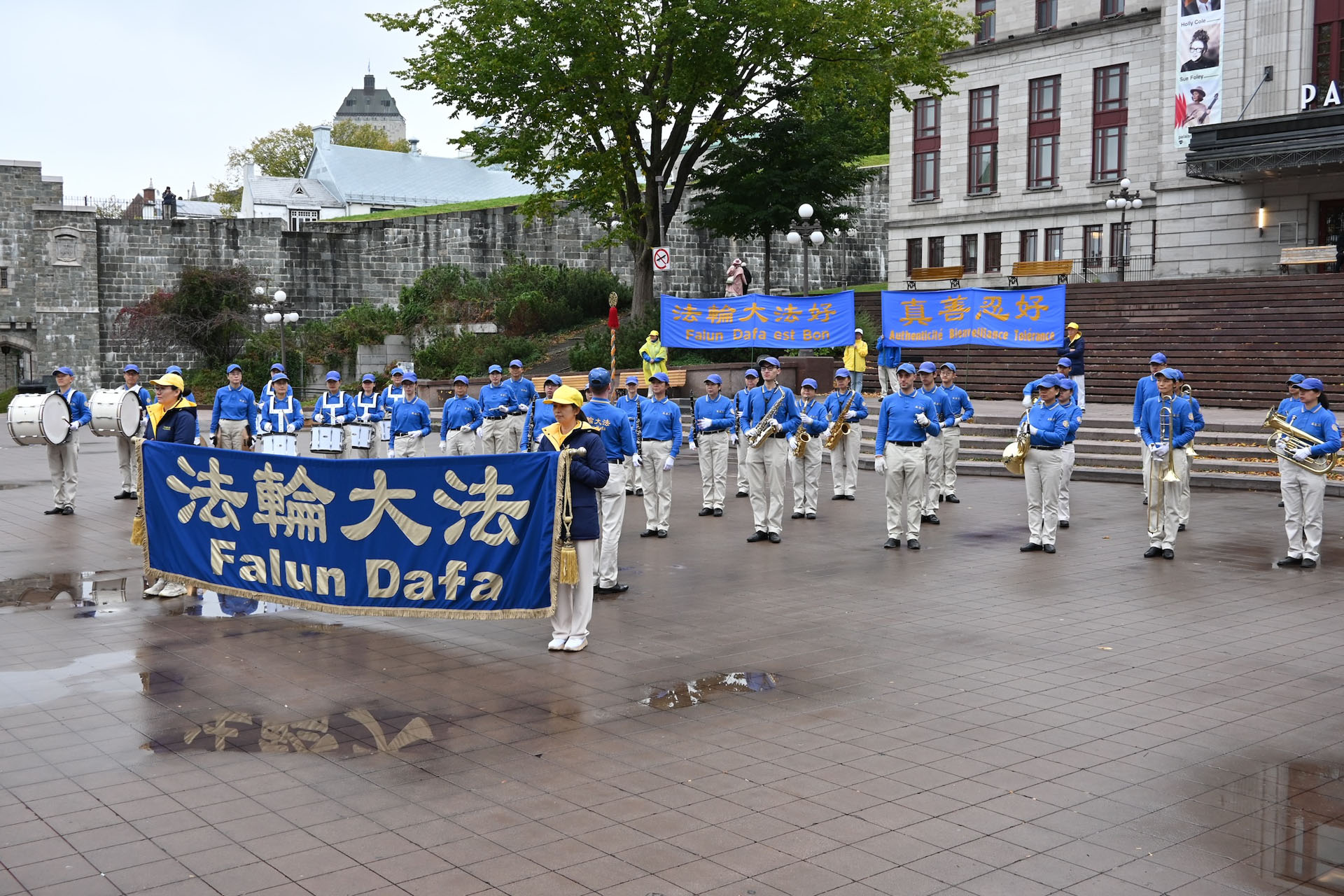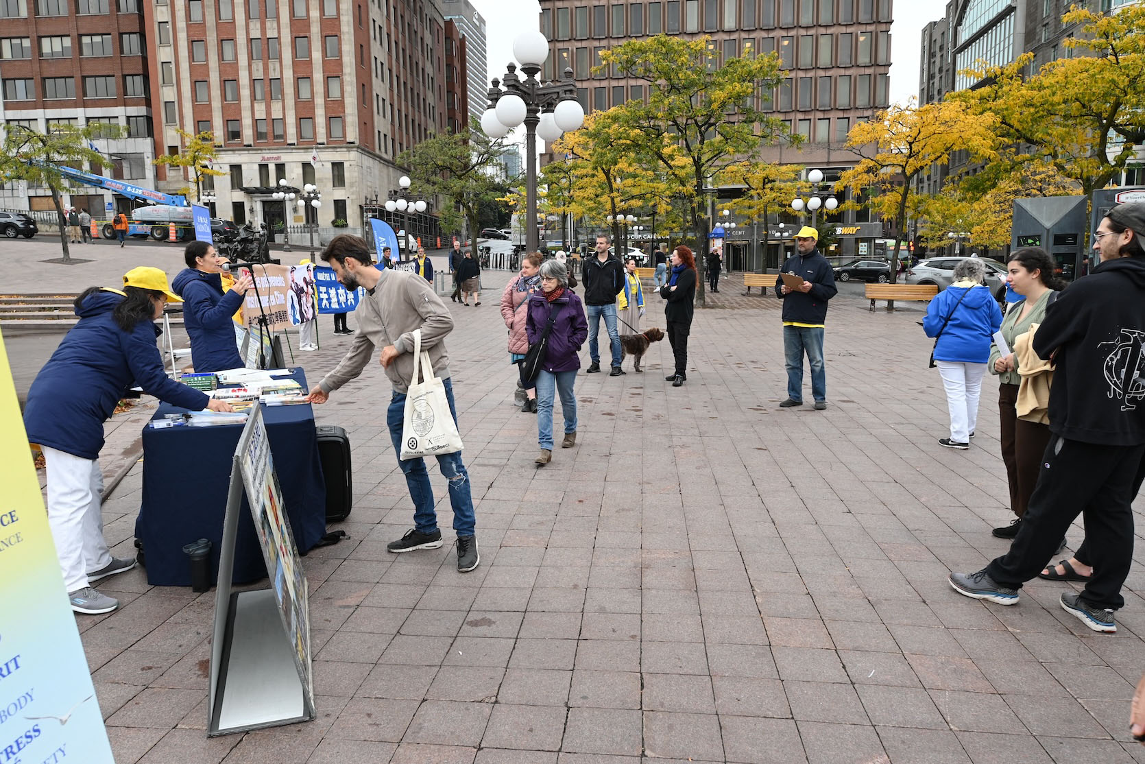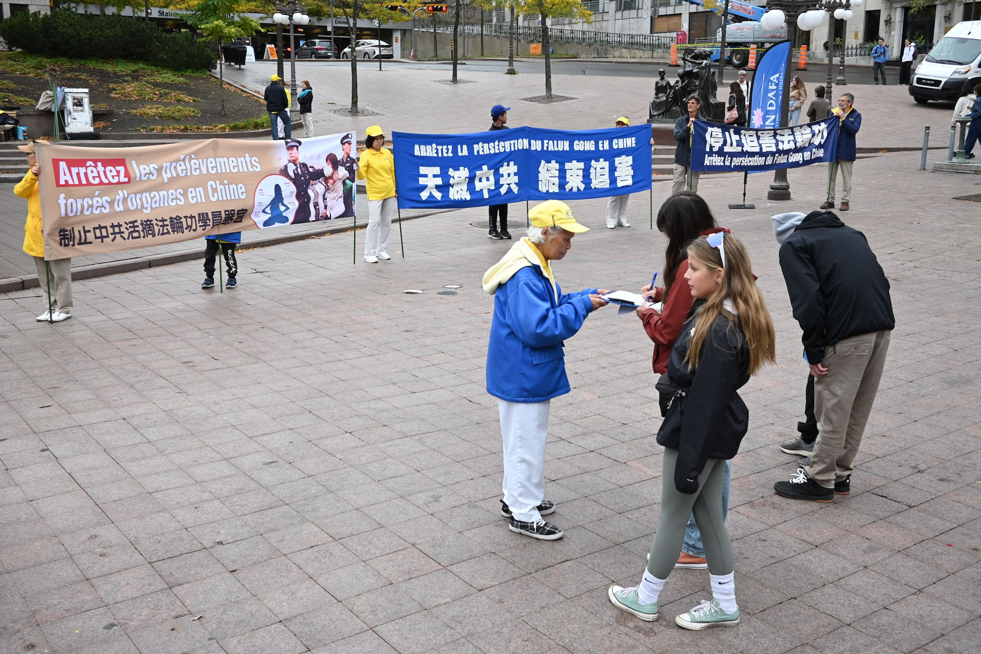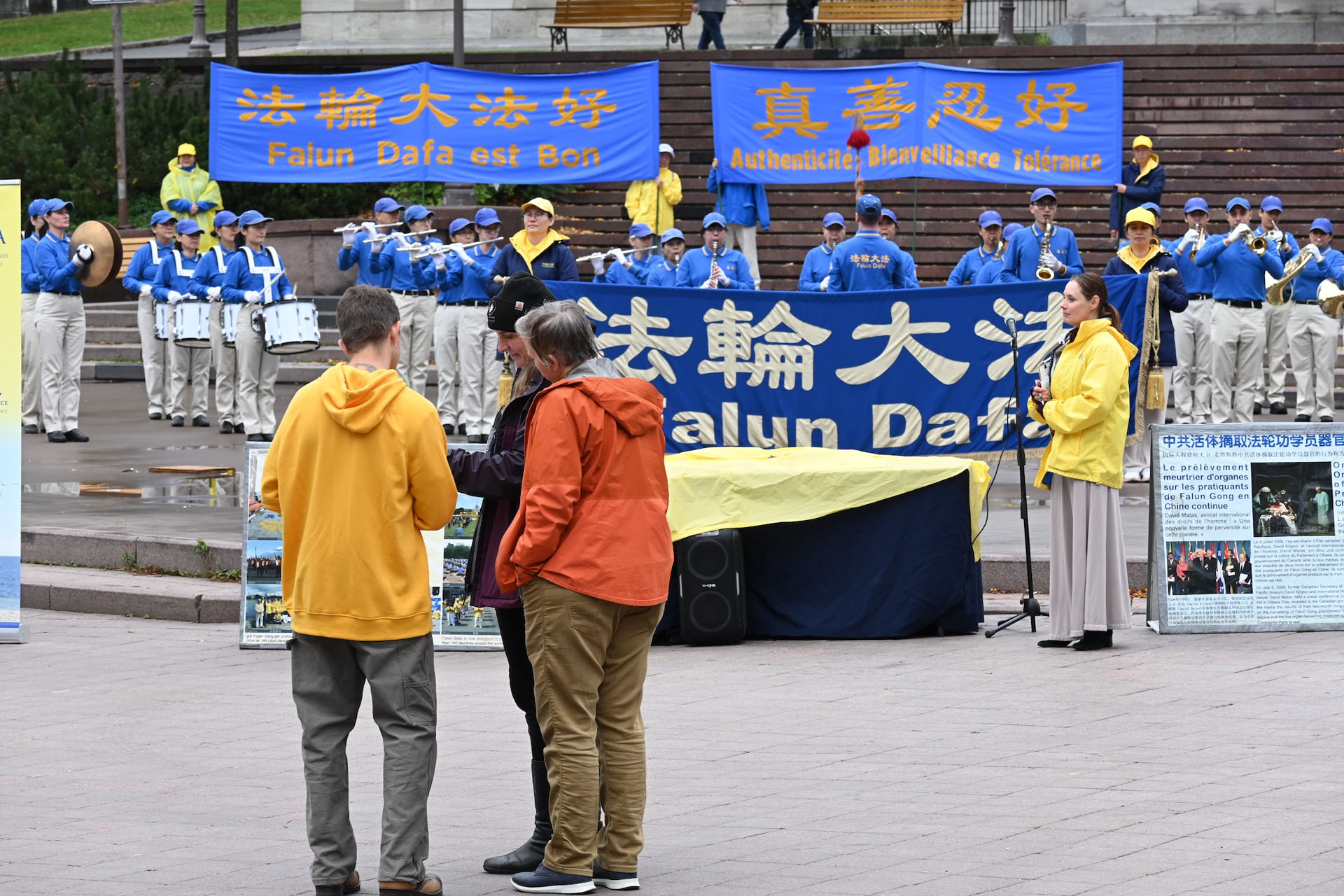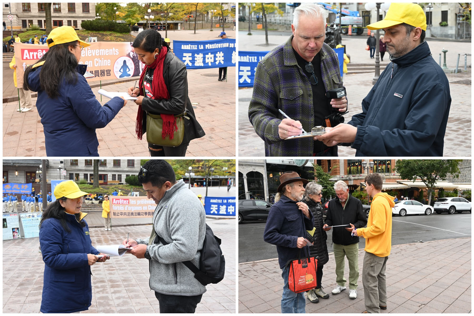 在活动现场,学员们还征集了签名,一份呼吁魁北克政府执行联邦法律,制止从法轮功学员身上活摘器官的罪行的请愿书。同时,他们向路人介绍了法轮大法并演示了功法。天国乐团的一些成员还进行了现场表演,吸引更多人了解真相。