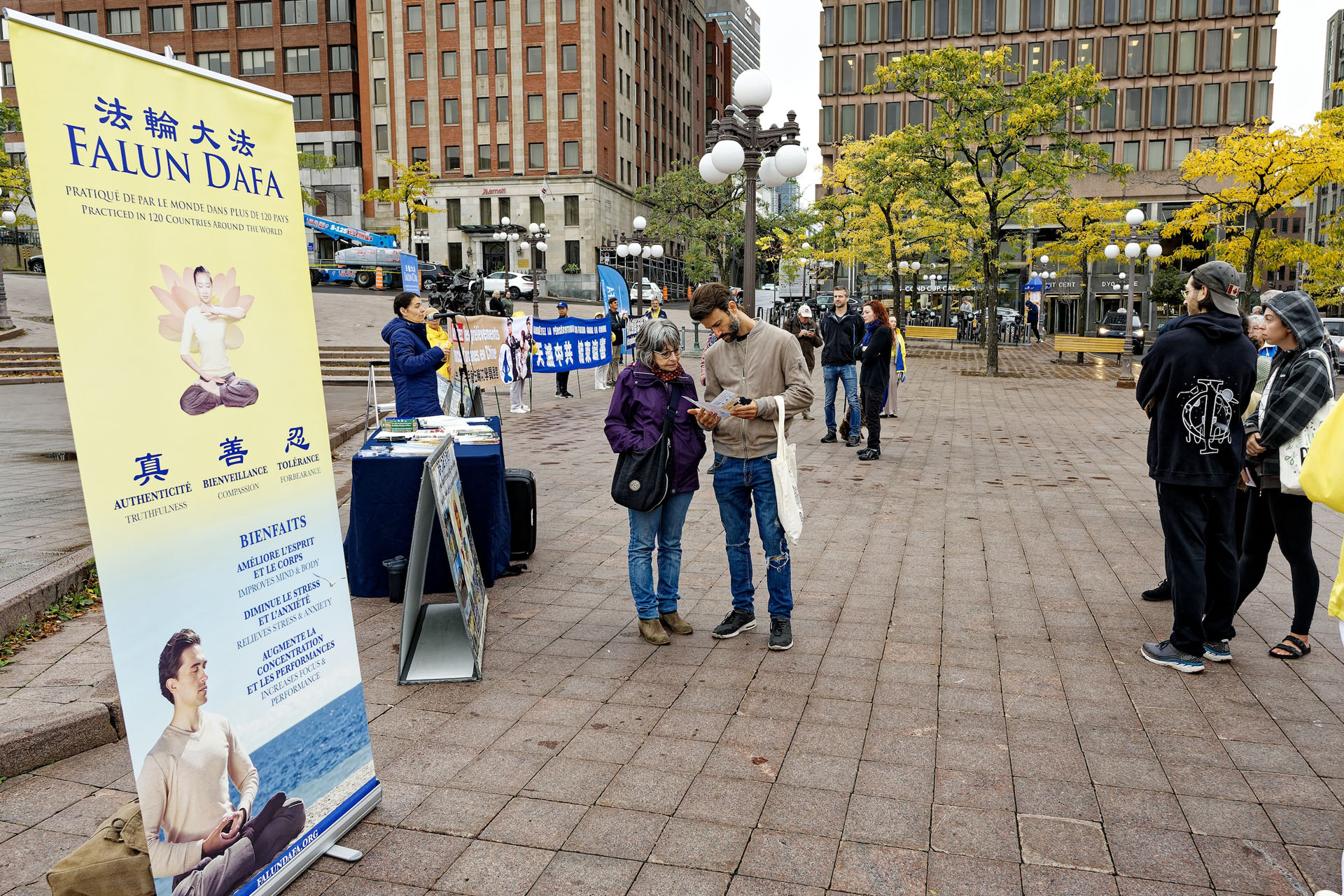 来自法国的情侣杰里米(Jérémie)和卡米尔(Camille)已经在魁北克生活了一年半,他们在经过法轮大法的展台时,被天国乐团的演奏吸引住了,并与学员们交谈起来。在看到关于活摘器官的展板后,他们特地拿了一份介绍法轮大法的传单。这是他们第一次听说这个功法。