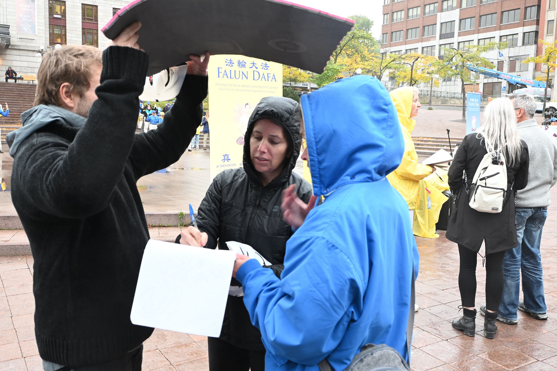 ![]() 图12:一对女士在细雨中签署请愿书 |
