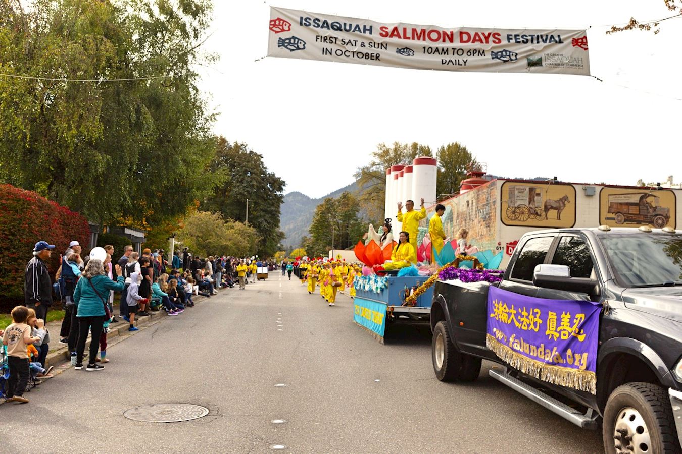 伊萨夸市也有很多华人居民,他们惊喜地看到法轮功队伍展现在眼前,其中有一家五口中国人在看到法轮功队伍后非常高兴,他们开心地接过了介绍法轮功的单张,并欣喜地念着“法轮大法”。