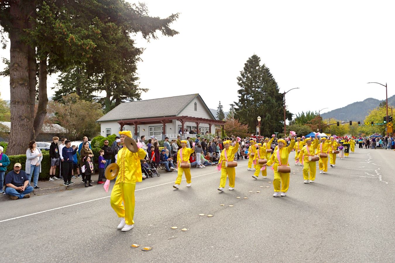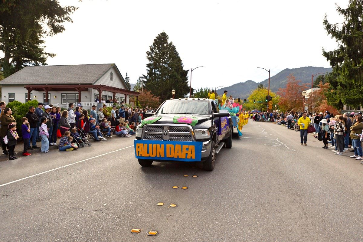 今年的三文鱼节游行一共有近六十个团体参加。法轮功学员们带来了精心装饰的花车,和现场观众分享法轮功功法的祥和与美丽;学员们还组成了腰鼓队,以展现中华传统文化的精彩。