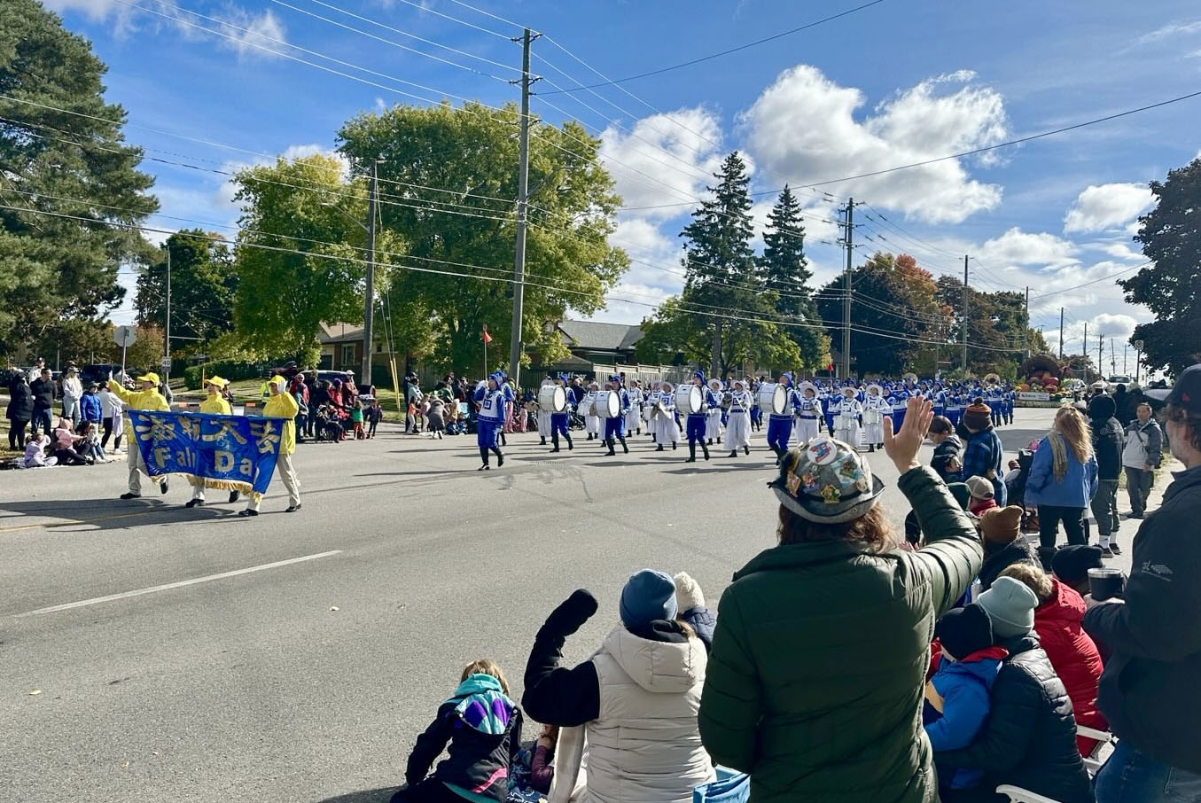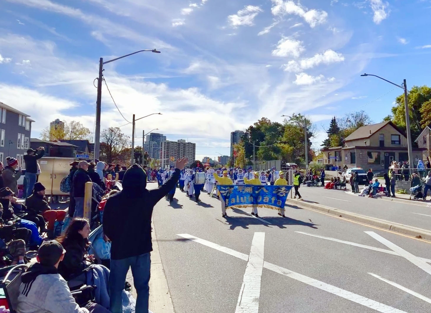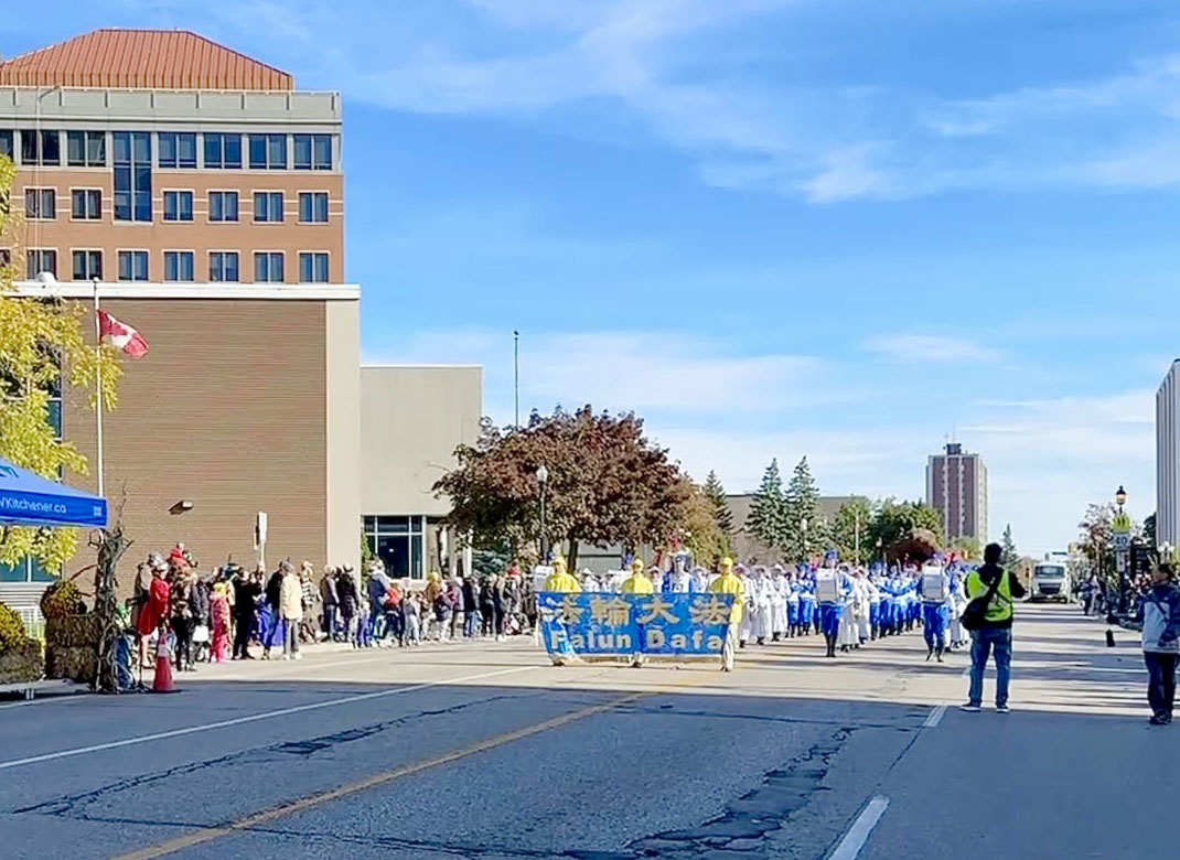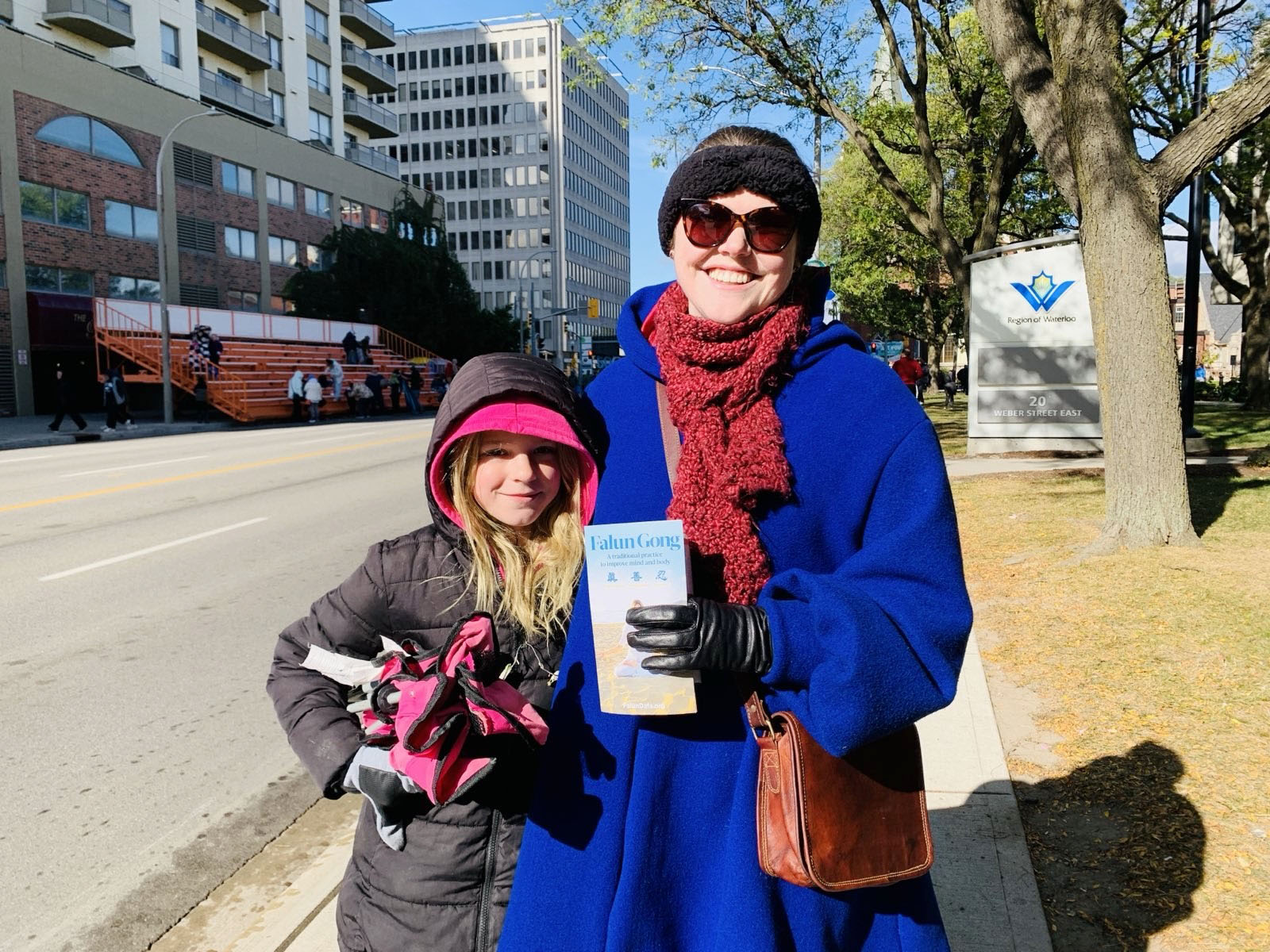 艾莉森(Alison)和她的家人来自安大略省的剑桥市(Cambridge),这次特意来基奇纳观看感恩节大游行。当法轮大法天国乐团方阵经过时,艾莉森便开始拍照、录像。