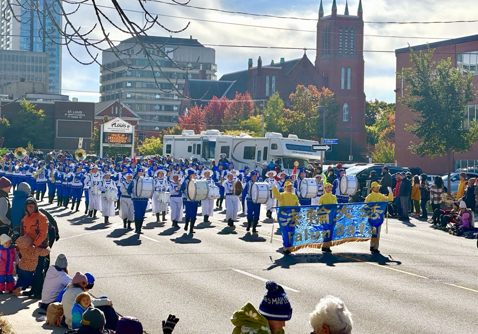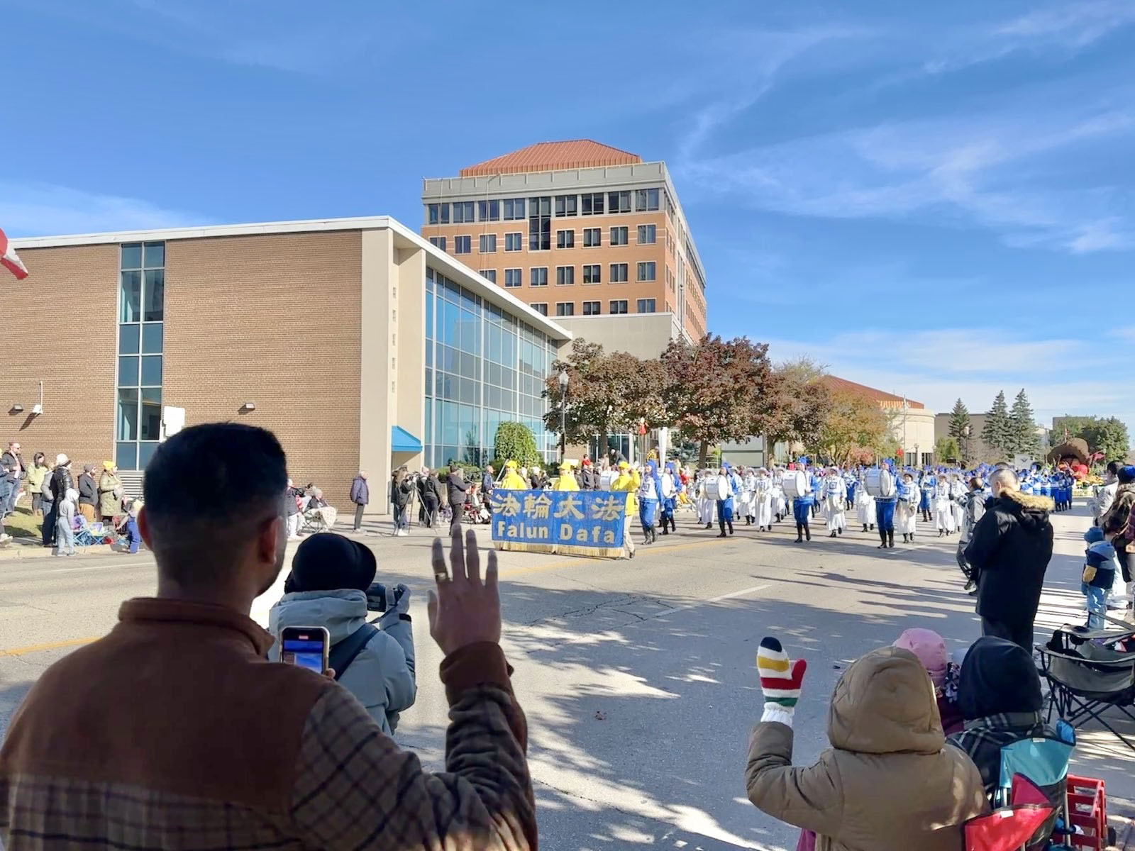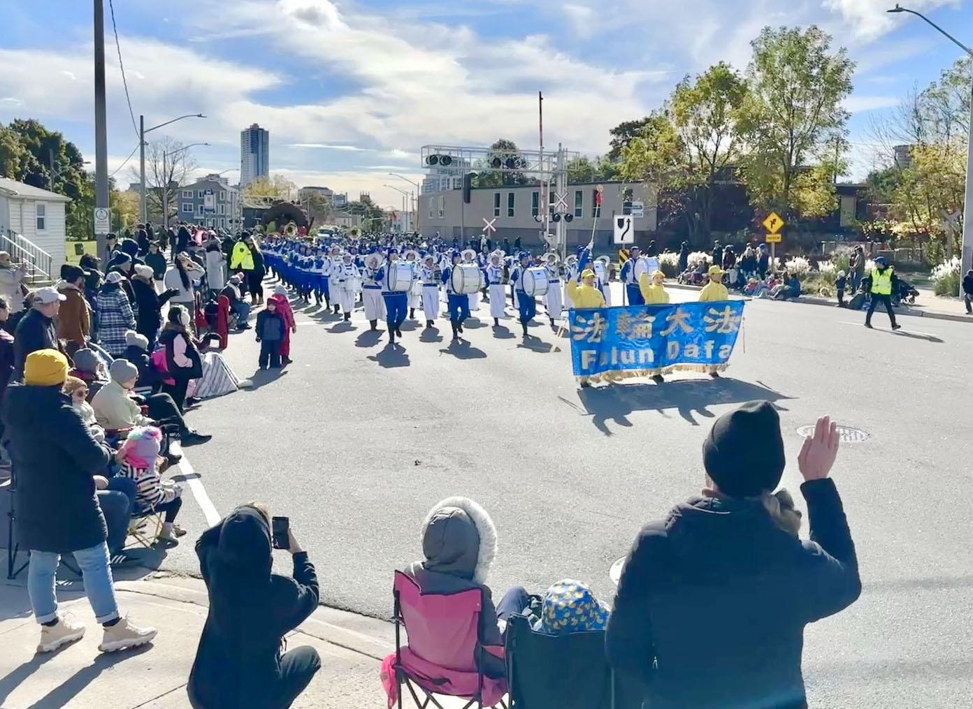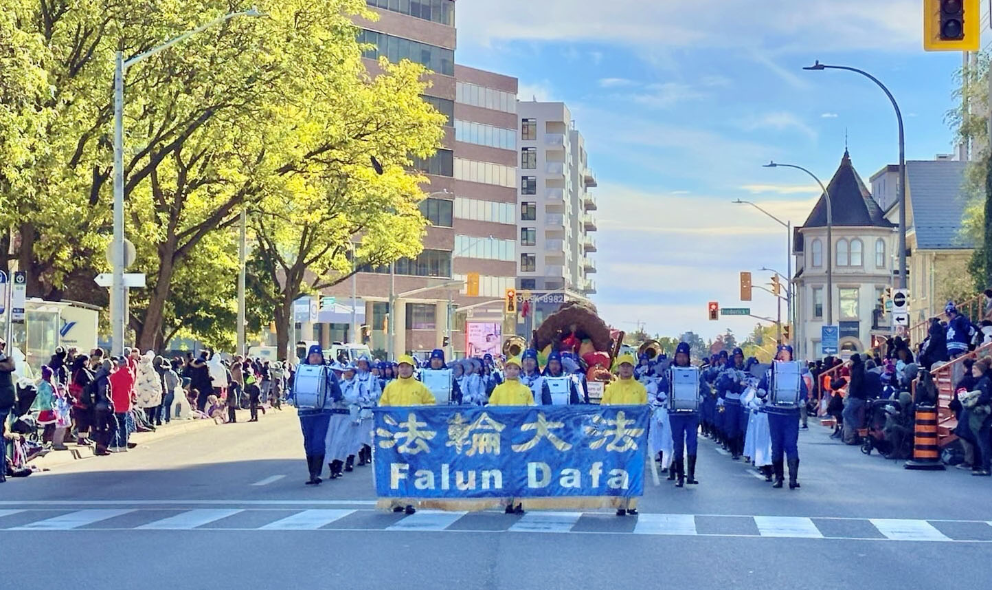 艾莉森(Alison)和她的家人来自安大略省的剑桥市(Cambridge),这次特意来基奇纳观看感恩节大游行。当法轮大法天国乐团方阵经过时,艾莉森便开始拍照、录像。