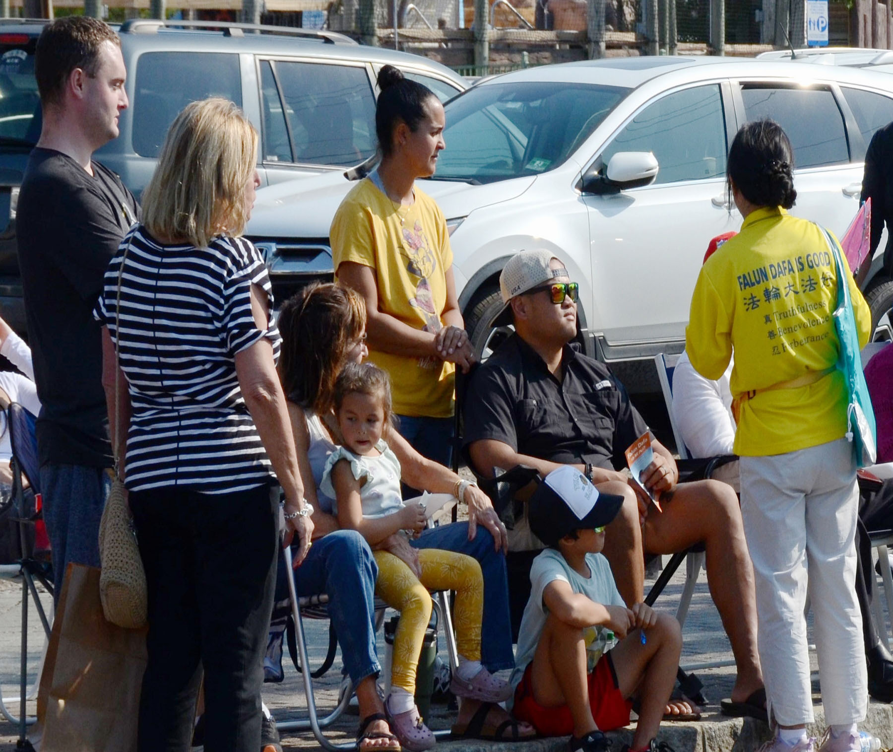 ![]() 图4:现场观众欣喜接过学员派发的真相资料,有的与学员交谈,想了解更多法轮功的讯息。 |