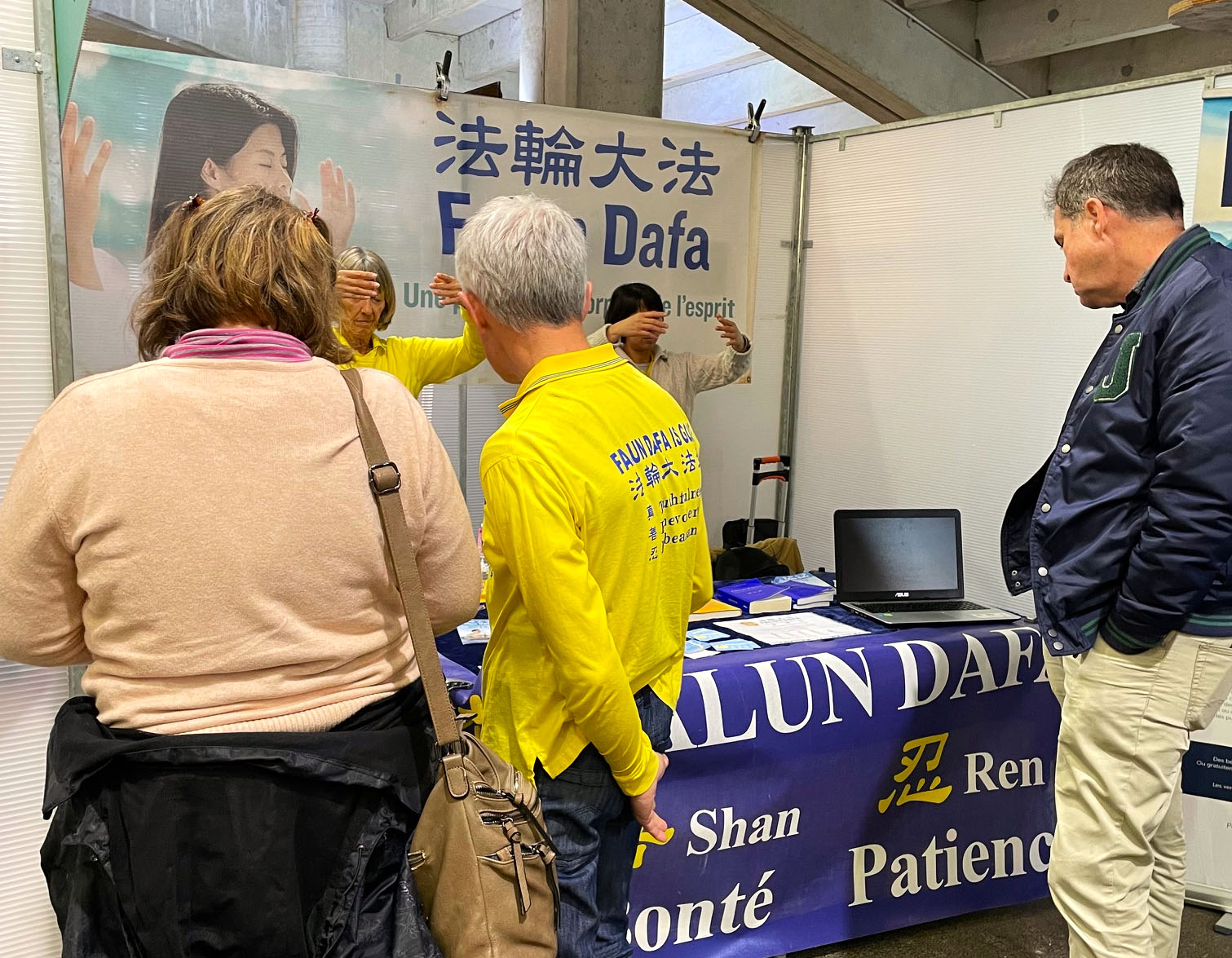 克里斯汀・蒙福特(Christine Monfort)的展位设置在法轮功展位旁边,她对法轮功修炼表现出浓厚的兴趣。她买了《转法轮》这本书,并表示这是一个好时机。她对中国文化充满热情。