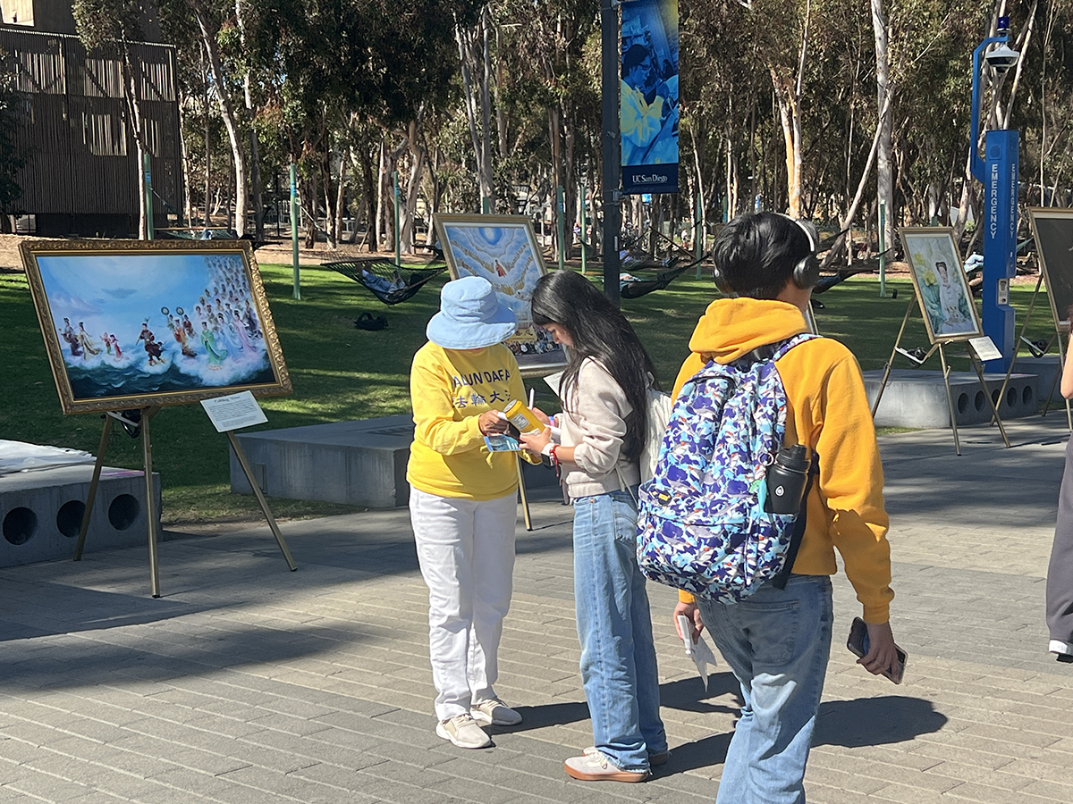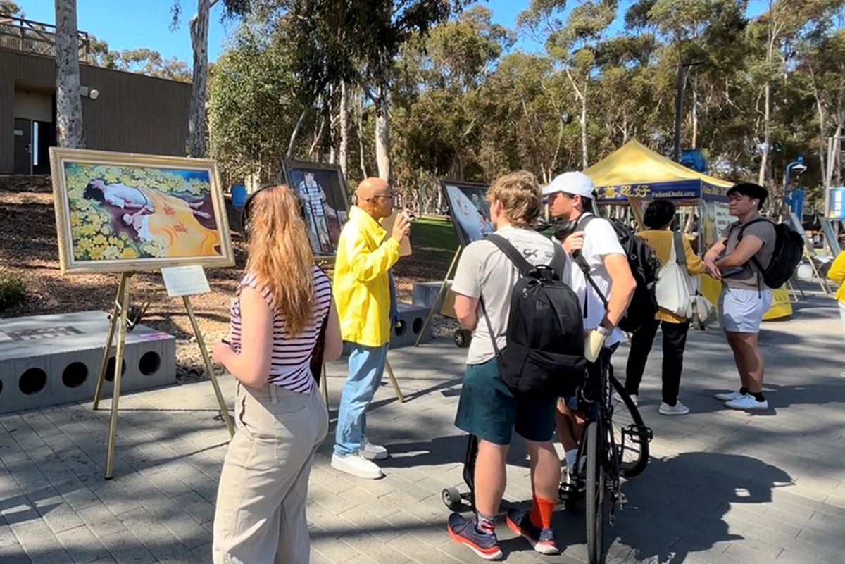 这次美展由加州大学圣地亚哥分校法轮大法学生社团主办,社团负责人菲利普(Philip)说,“今年预约到的时间很好,是新学年刚开学,而且我们办画展需要较大空间,一般比较难找到,而这次刚好有足够的展位给我们。真为学生们有机会观看画展,了解法轮功的讯息而高兴。”