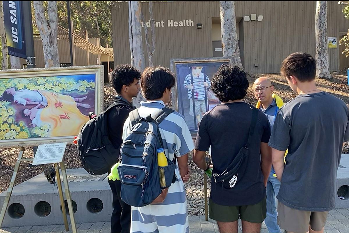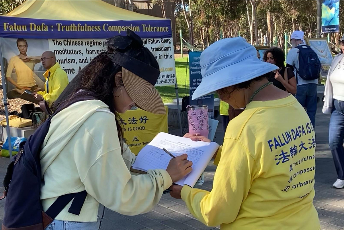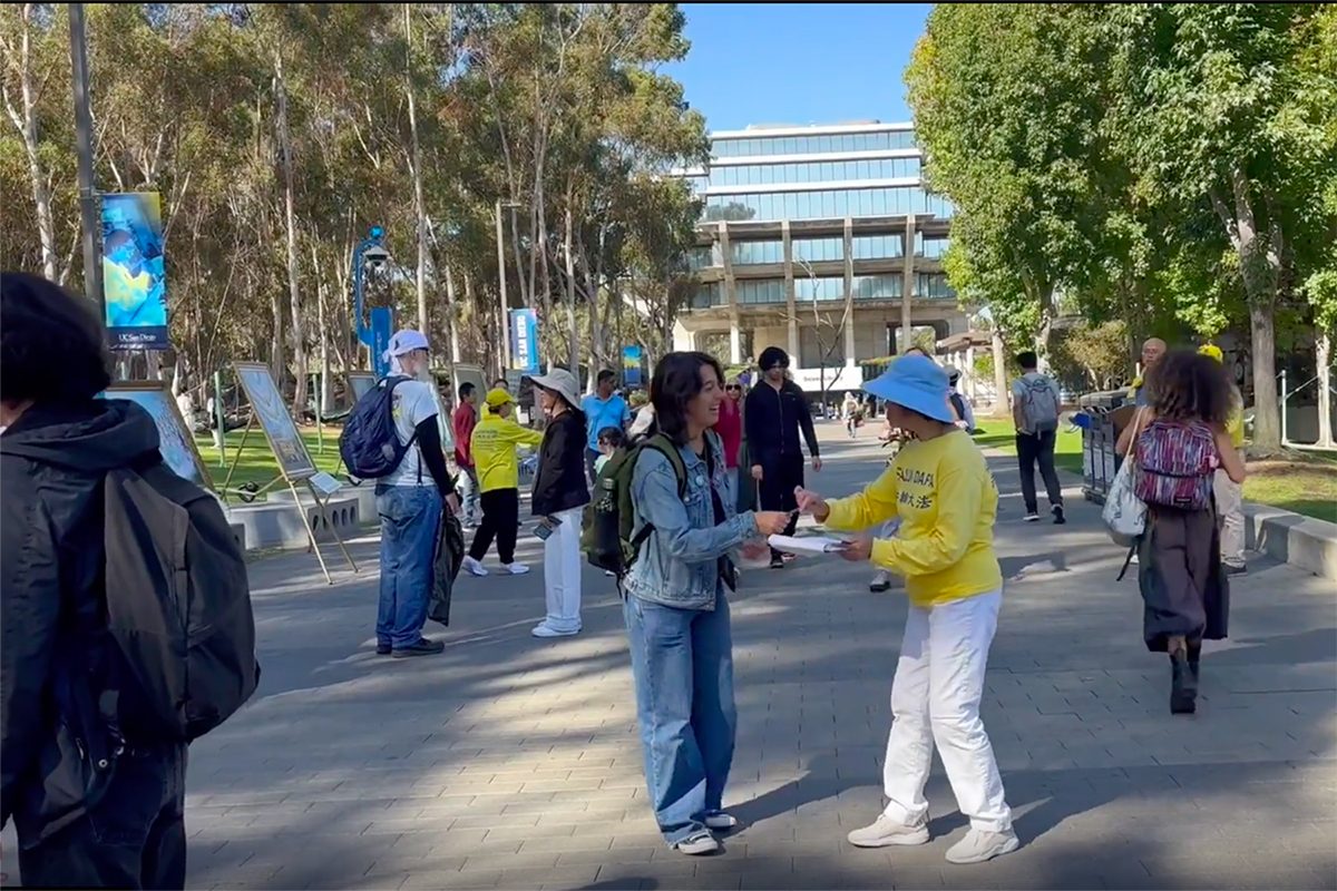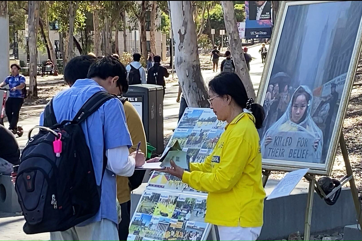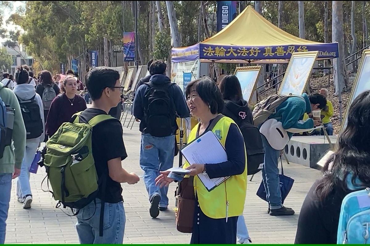 画展所在的“图书馆大道”(Library Walk)上,来来往往的人群中,有很多中国大陆留学生。法轮功学员苏女士说,“以往在这里讲真相,有不少中国留学生看到我们都绕着走。但是这次画展,真的很不一样,很多中国留学生不但来听真相,而且还签上自己的名字支持法轮功,支持美国参议院提出的《法轮功保护法案》。这真的需要勇气和正义感。”