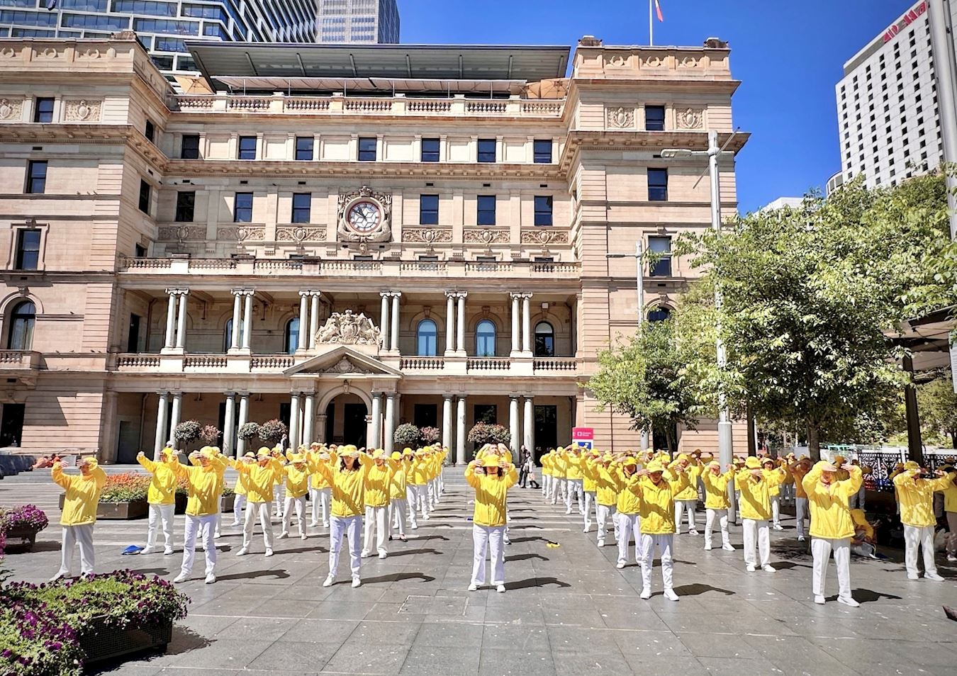 ![]() 图4:法轮功学员在悉尼市政厅前集体炼功。 |
