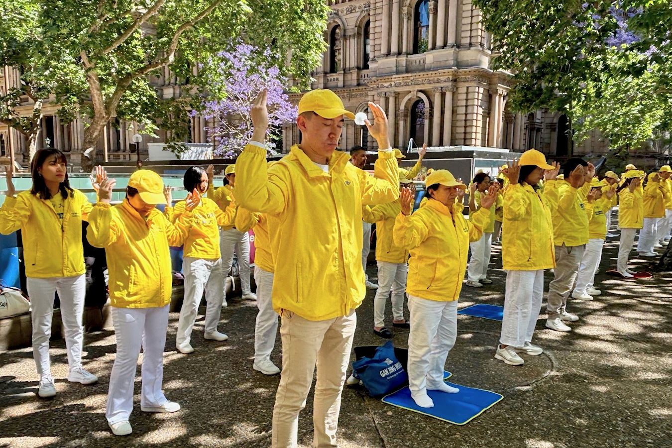 ![]() 图1:法轮功学员在悉尼海关大楼前集体炼功。 |