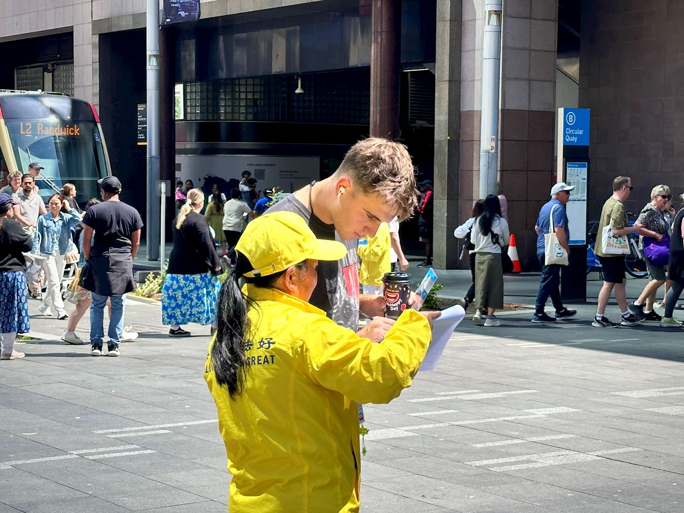 人们驻足观看法轮功学员的功法演示,很多人接过真相资料,并在制止中共迫害法轮功的征签簿上签名,支持法轮功学员和平反迫害。人们赞美真、善、忍。有的人表示“每个人都应该努力实践和遵循这些价值”,还有的人谴责中共迫害善良。