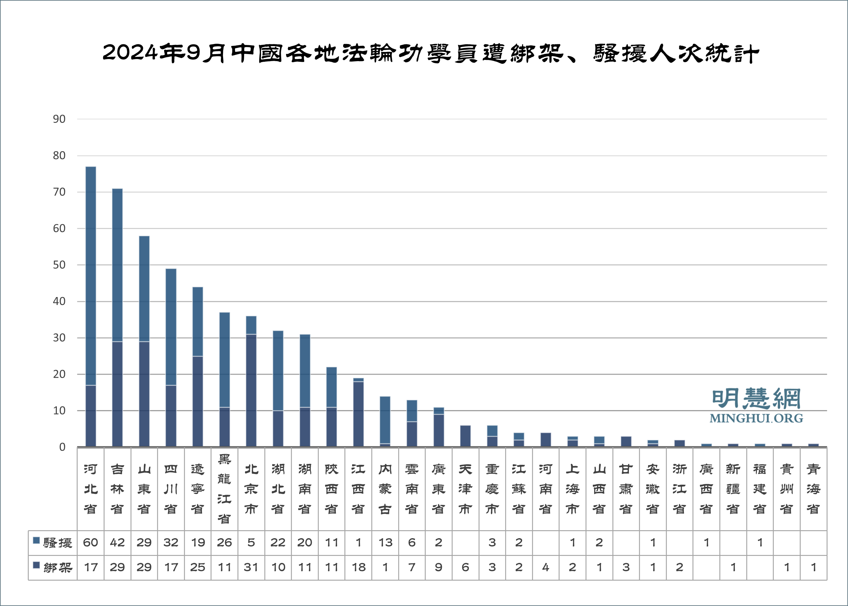 ![]() 图1:2024年9月中国各地法轮功学员遭绑架、骚扰人次统计 |