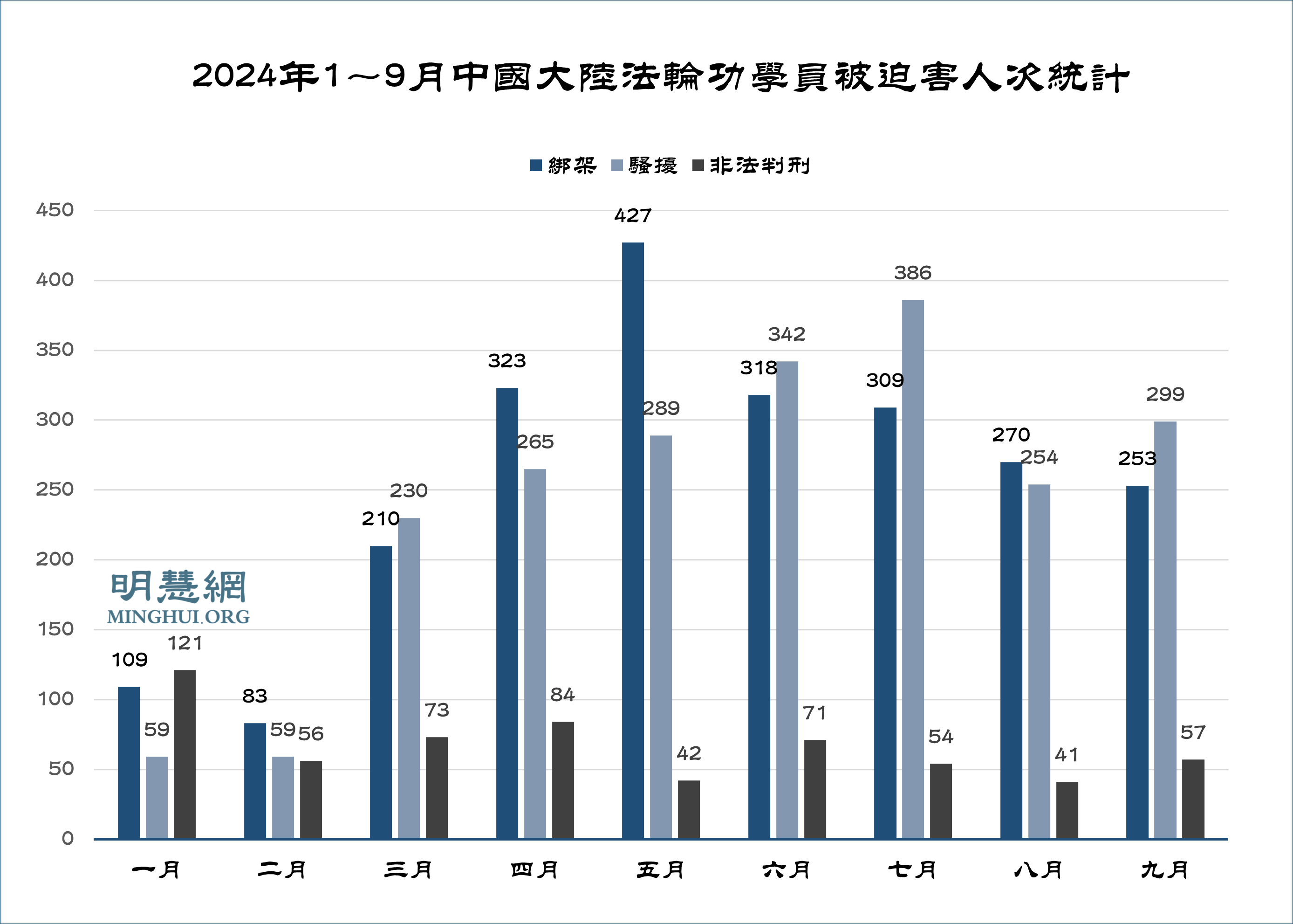 ![]() 图2:2024年1~9月中国大陆法轮功学员被迫害人次统计 |