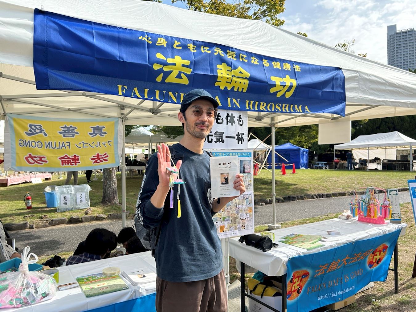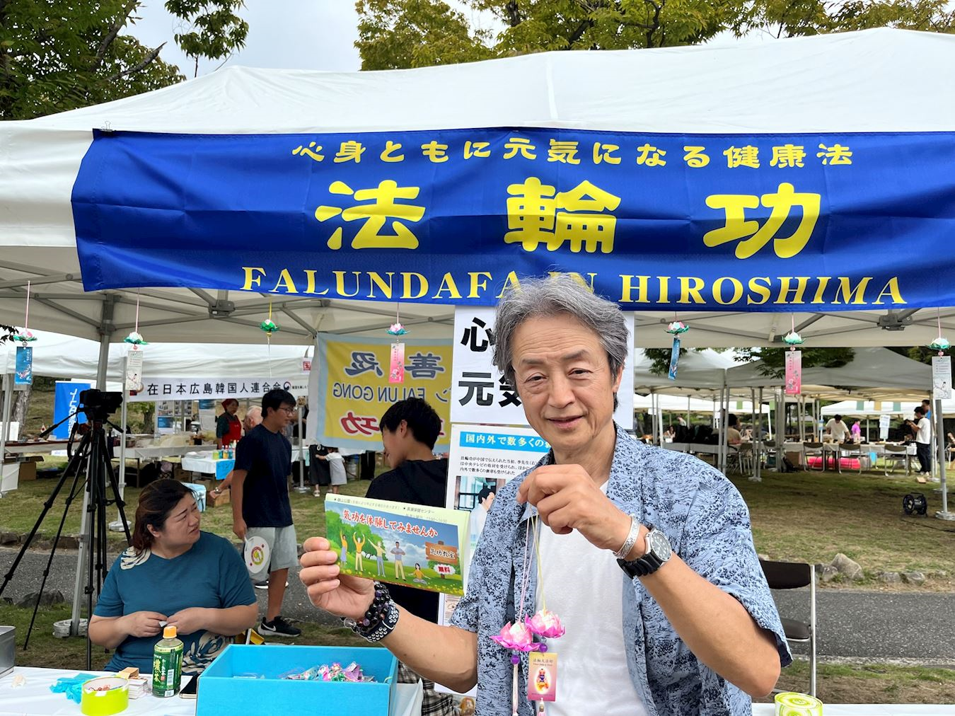 从大阪来广岛观光的河濑(Kawase)先生,看到法轮功的展位就主动前来询问。学员告诉他法轮功是气功健身法,以遵守真、善、忍原则最为重要,平时总是保持一个良好的心态,然后加上五套功法动作,效果最佳。在大阪城也会碰到法轮功学员炼功的。他高兴的拿了资料离开了。