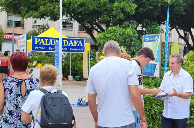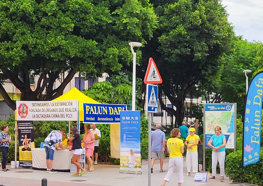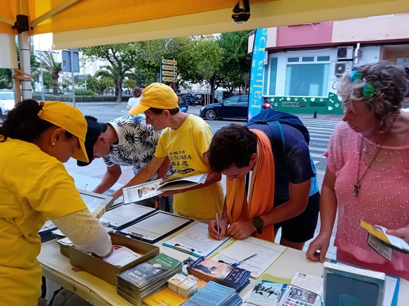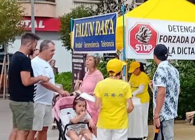 法轮功学员们在位于甘迪亚市最受游客青睐的区域:风之玫瑰大道(Paseo Rosa de los Vientos)设置展台,向来来往往的游客们递上真相传单,并告诉人们中共在中国大陆迫害法轮功学员的真相。明白真相的游客们都非常支持法轮功,纷纷签名声援。