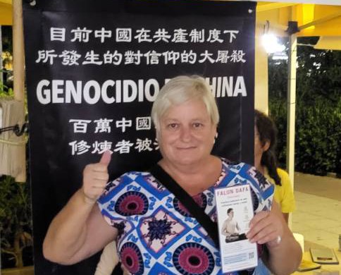 今年五十五岁的克里斯蒂娜(Cristina)女士与她的先生来此地旅游,她路过展台时,看到展板上的揭露中共种种暴行的图文后,非常震惊,马上走过来对学员说:“这简直太残忍了!必须制止中共的罪恶!我能为你们做些什么?”当得知签名可以帮助制止中共迫害后,她立刻与先生一起在签署书上签了名。