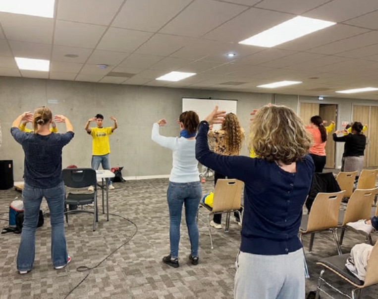 十月五日和六日两天,法轮功学员参加了雷恩体育馆举办的健康博览会,星期六的下午,在展会会议厅,法轮功学员进行了功法演示,同时教有兴趣的来访者炼功动作。功法演示和教功吸引了很多人。参与者表示希望能更深入地学炼法轮功。