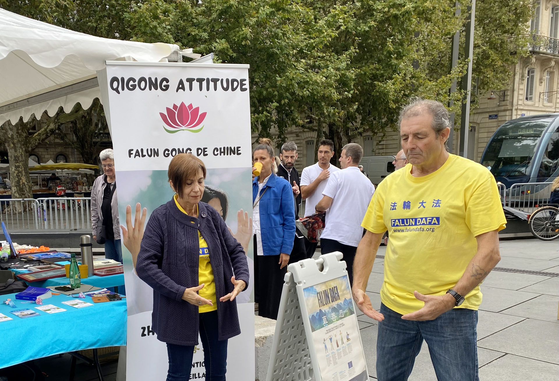 几位身着亮黄色 T 恤的法轮功学员,在展台前演示法轮功功法。很多人对功法感兴趣,报名参加周日课程。法轮功炼功点在波尔多市公众花园(Jardin Public),每周日都有法轮功学员在那里炼功和教功。