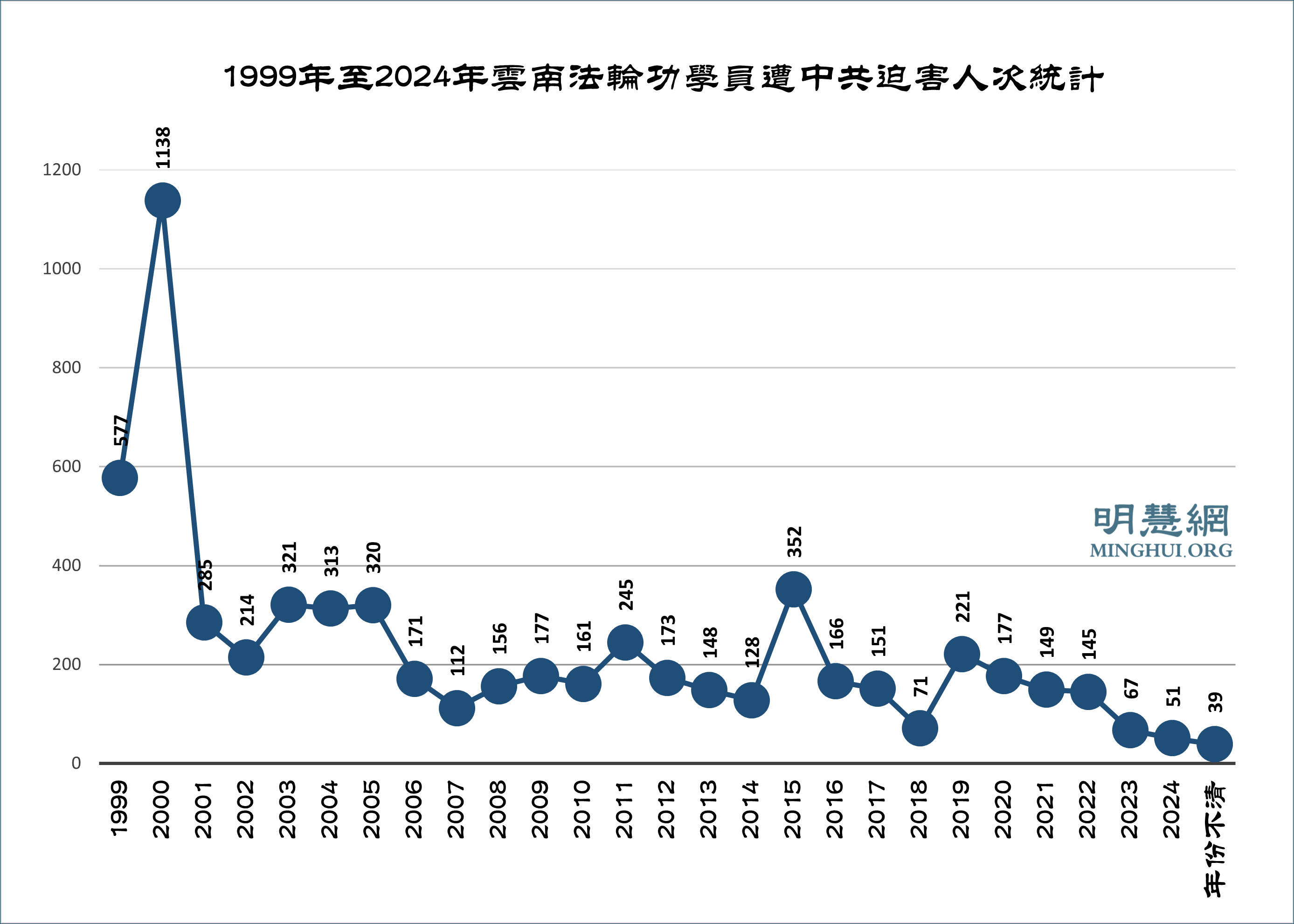 ![]() 图1:1999年至2024年云南法轮功学员遭中共迫害人次统计 |