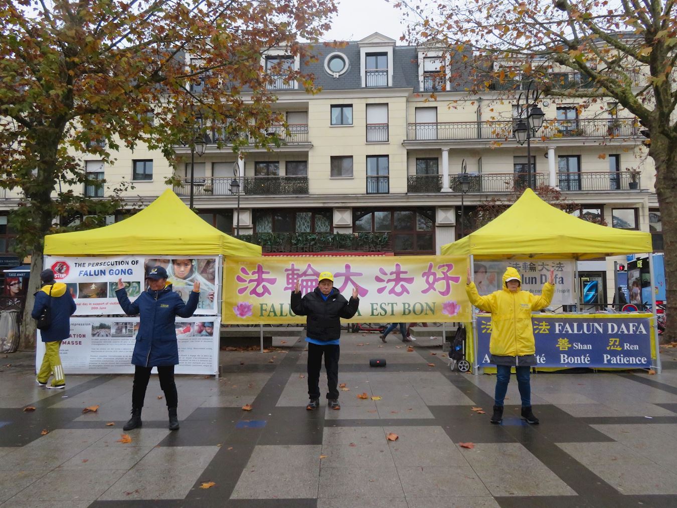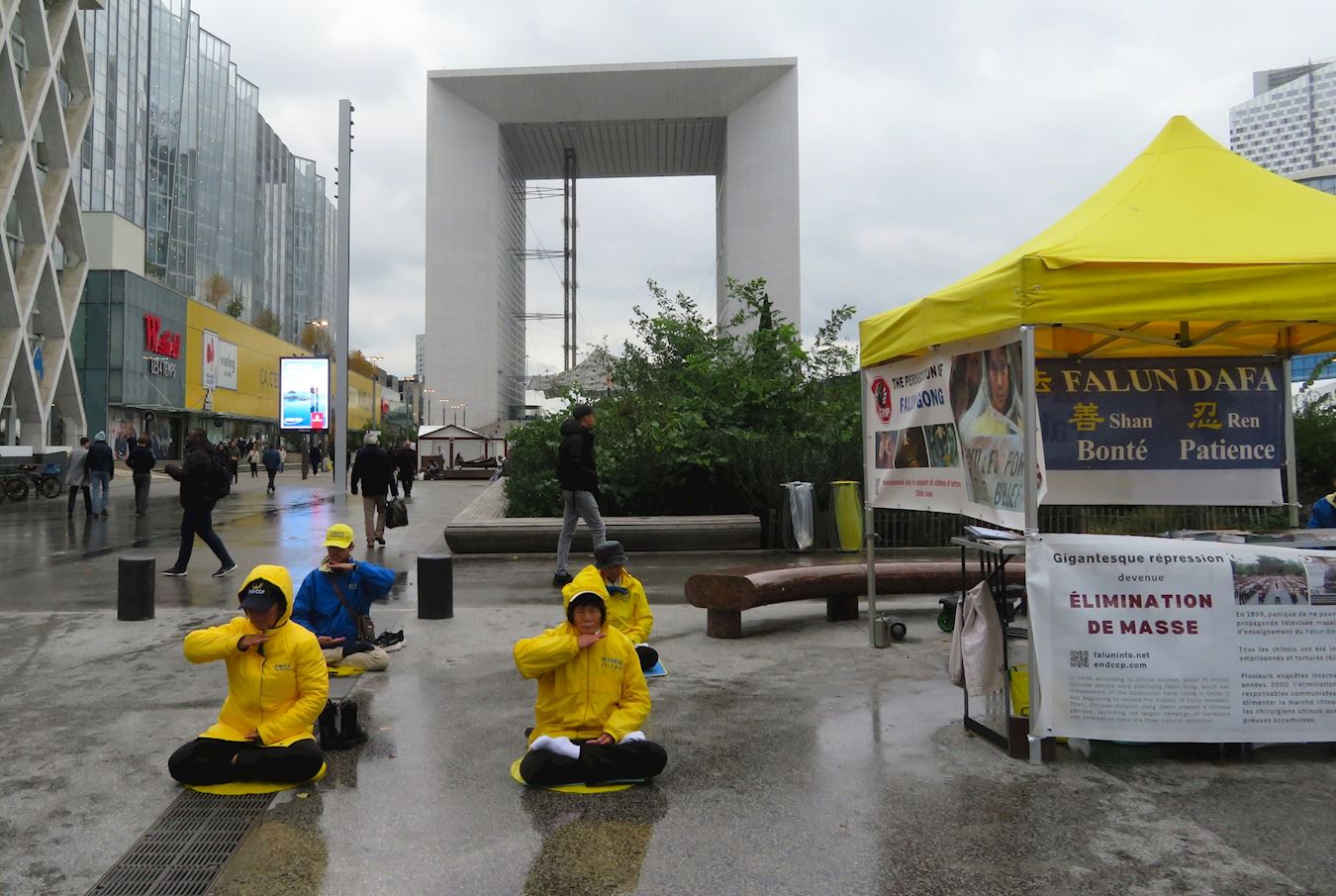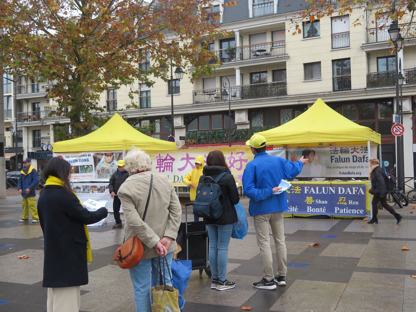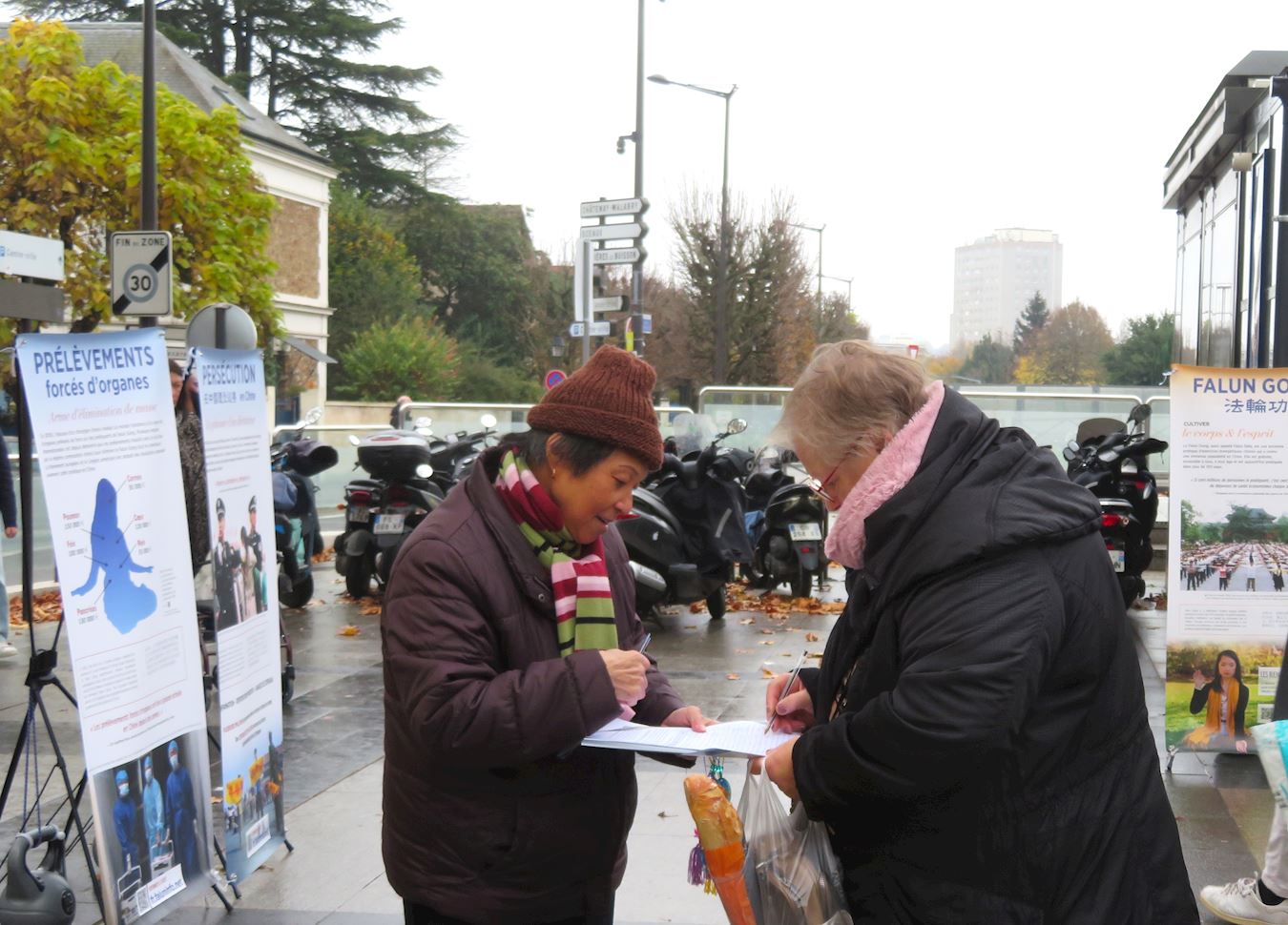 一位女士看见法轮功学员安静、祥和的打坐,她说,法轮功学员形象善良,给她留下很好的印象。表示很想学炼法轮功。她签名后,拿了巴黎炼功点的信息资料后才离开。