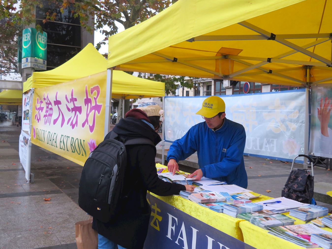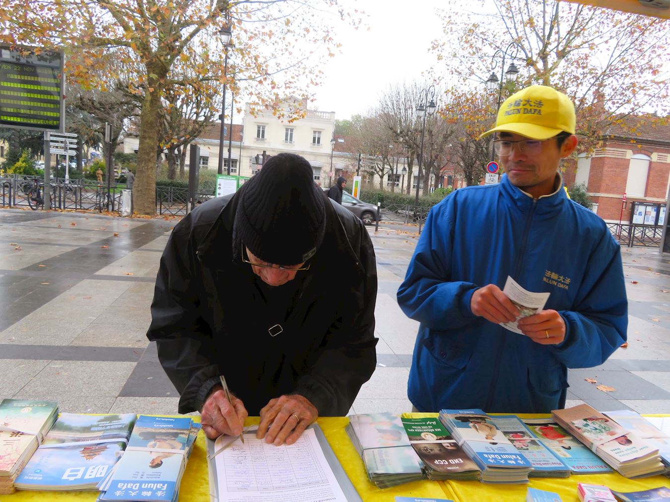 十一月十七日,在巴黎南郊安东尼火车站广场的法轮功信息日,吸引了很多去附近早市买菜的居民和上下郊区火车的人。杰拉尔(Gérard)这天路经火车站,早在二零零零年前后,杰拉尔在安东尼就遇见了法轮功,那时也是在安东尼的一次讲真相活动上,他记忆犹新。