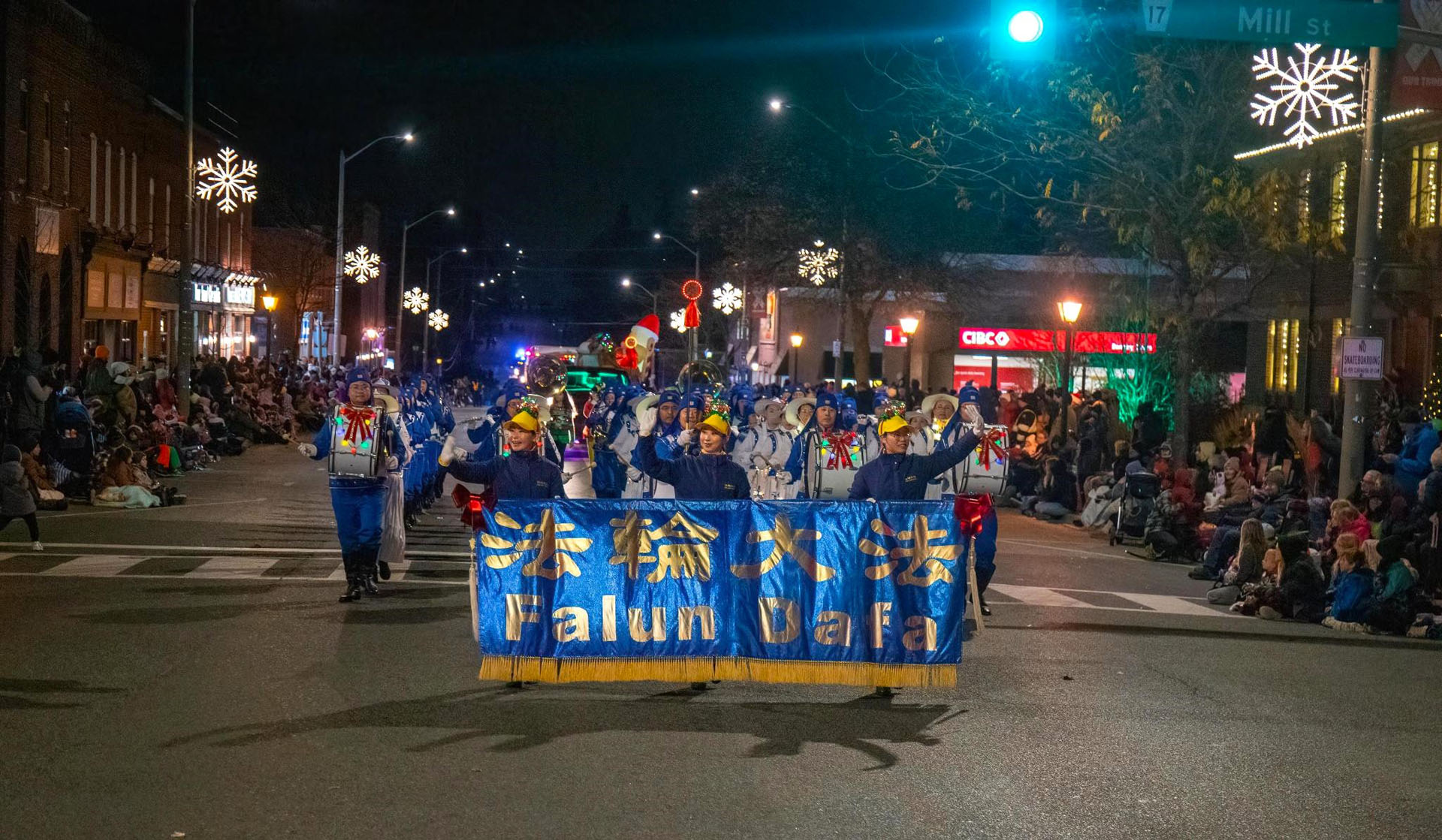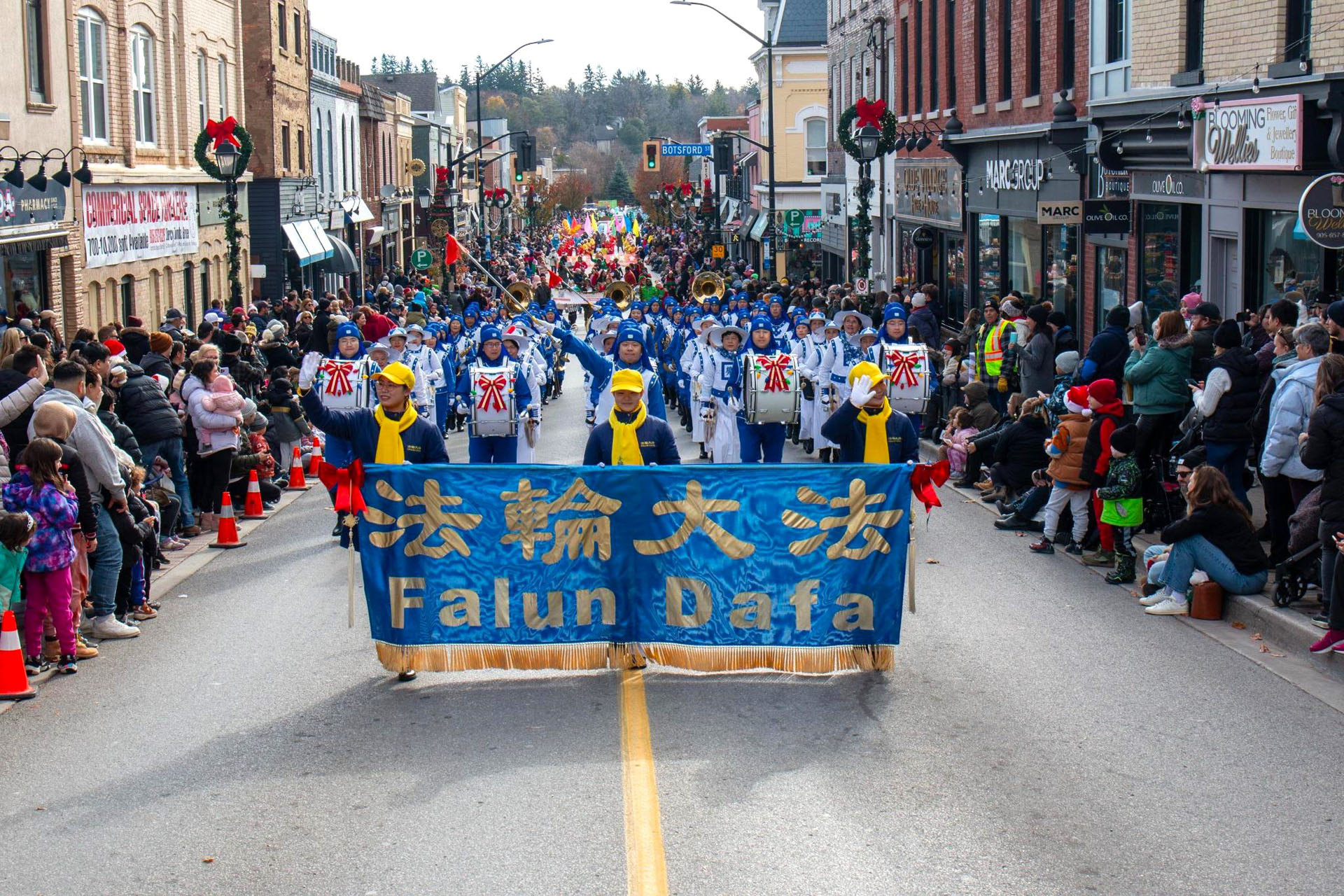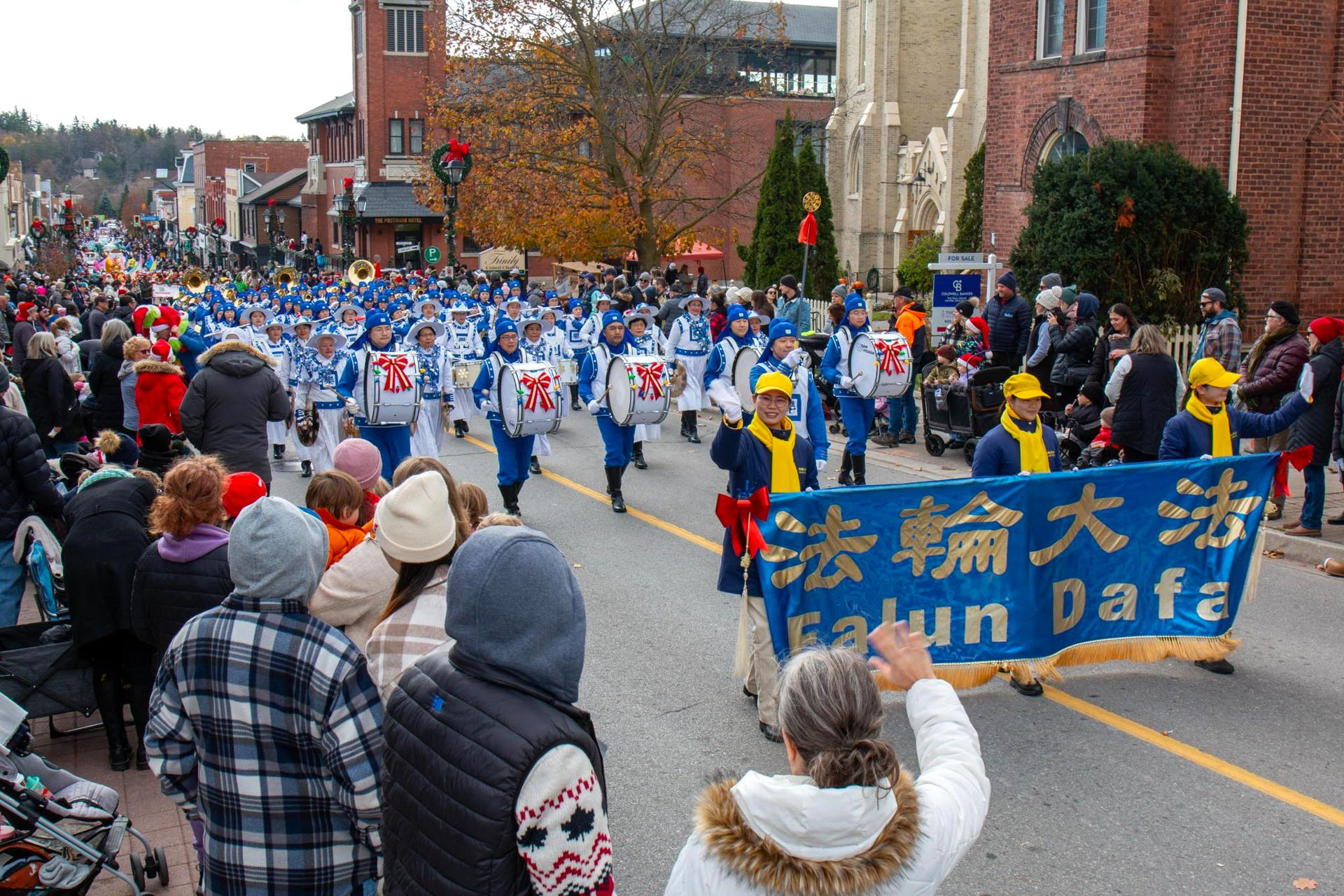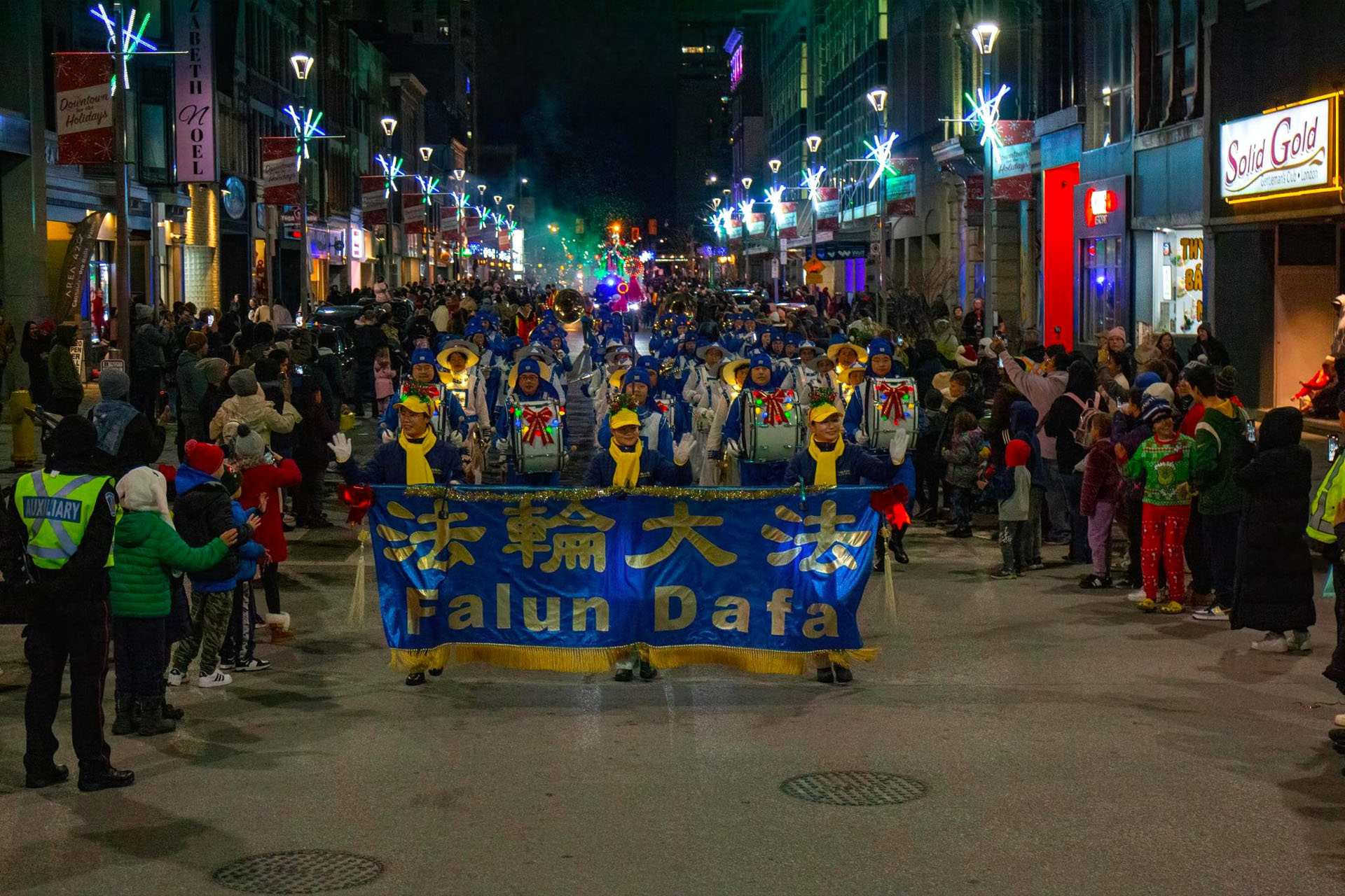 乐团演奏的曲调既为人们带去了圣诞的祝福,也将法轮大法真、善、忍的纯正与美好传递给各地居民。观众们纷纷送来掌声与欢呼,表达内心对法轮大法的欢迎和赞许。