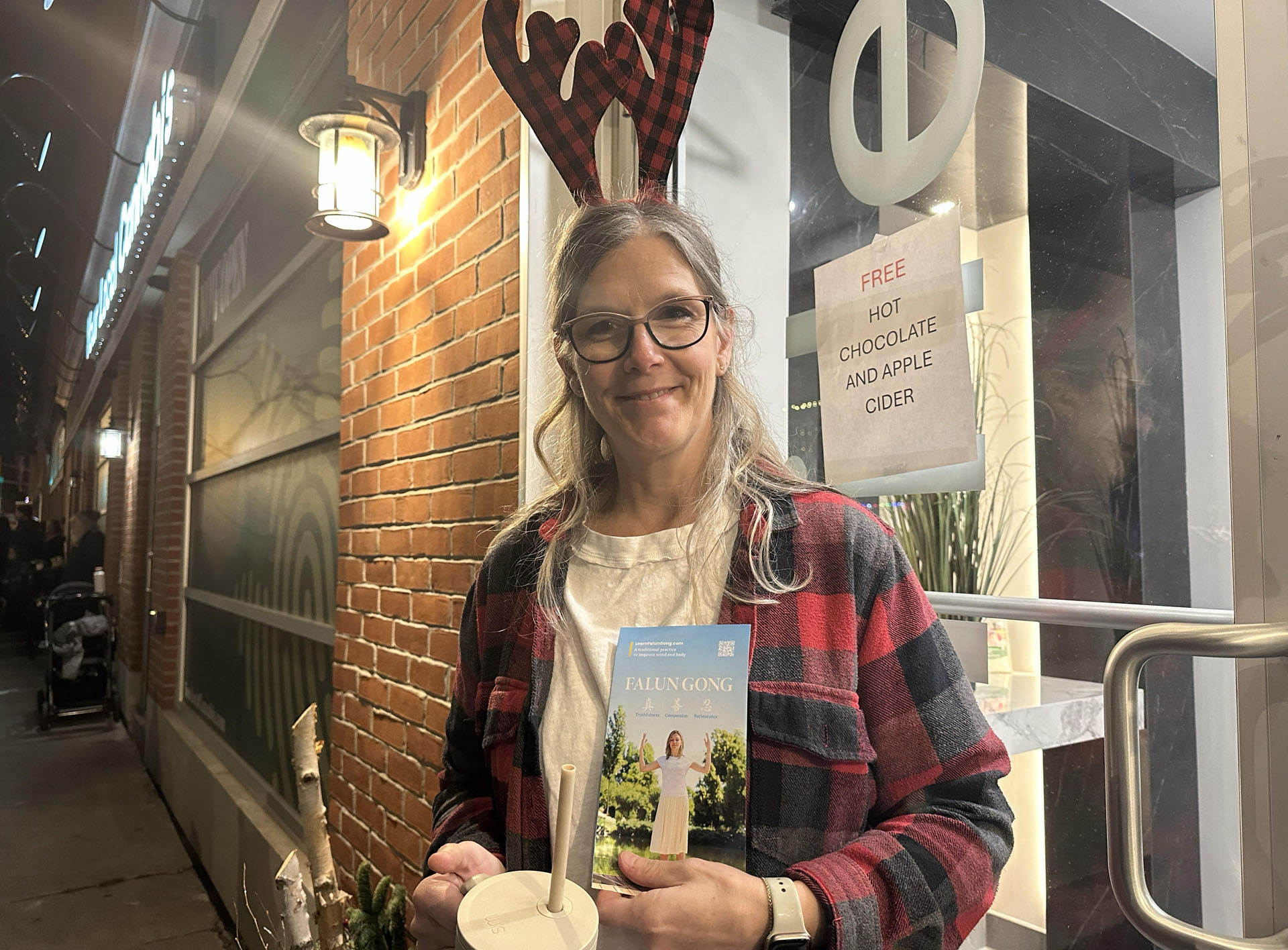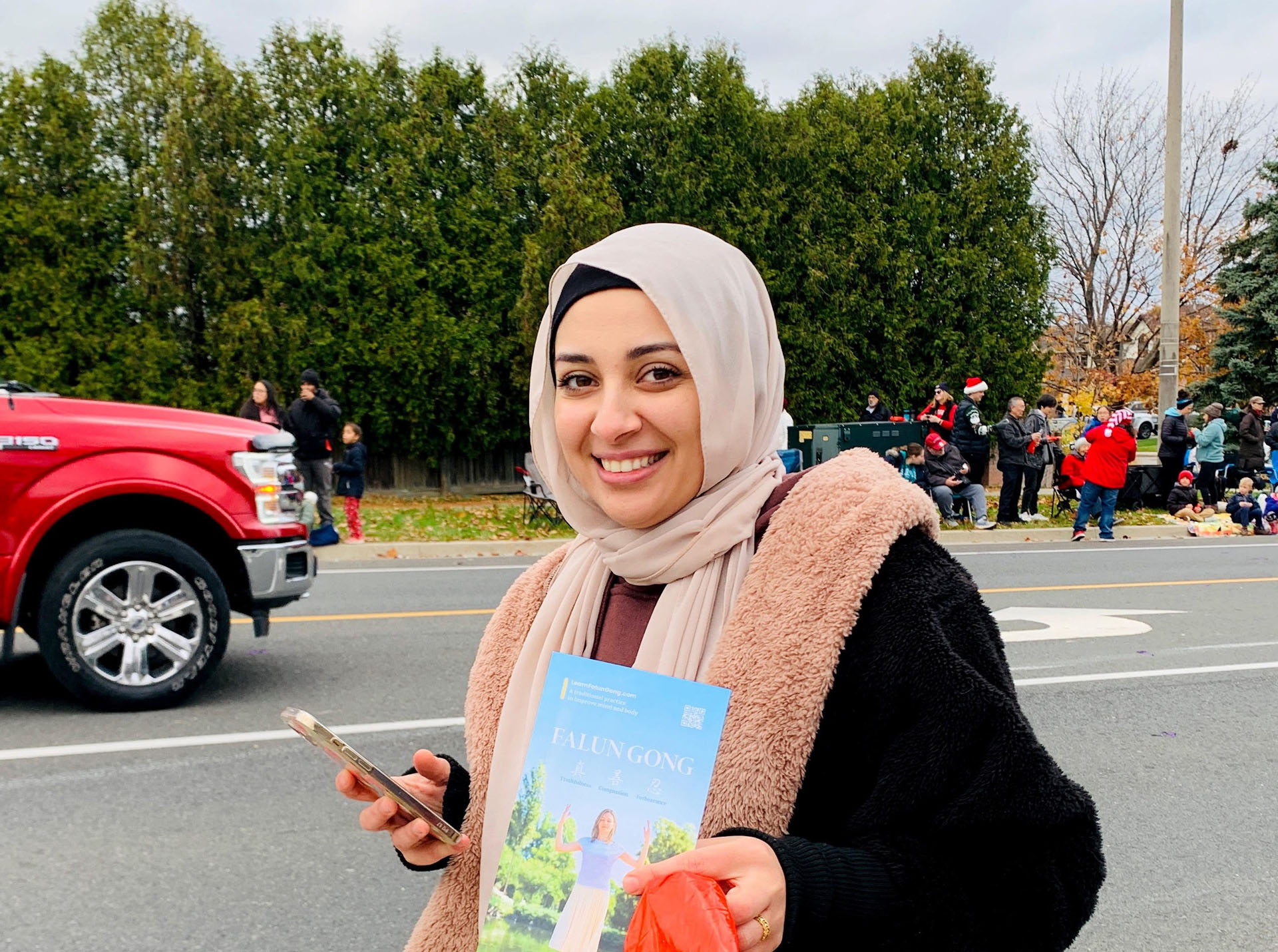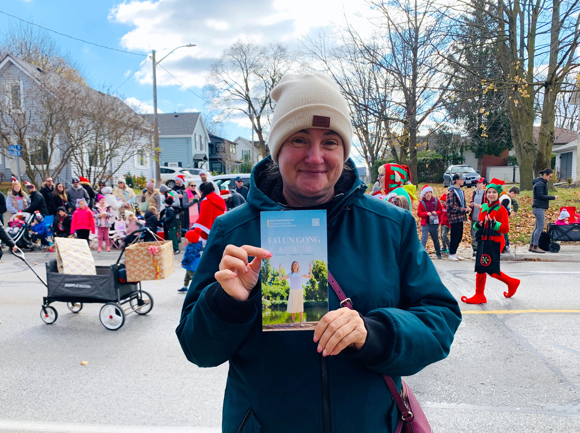 学员向宝拉提到乐团成员都是法轮大法修炼者,用真、善、忍的理念要求自己,参加圣诞游行就是向社区传递美好的信息。听着学员的介绍,宝拉不由地表达了喜爱,并说:“我认为这是做人的重要的原则,人就是需要真诚,待人友善,所以我是完全支持的。” 学员介绍了免费的线上学功网址,宝拉表示会去多了解。