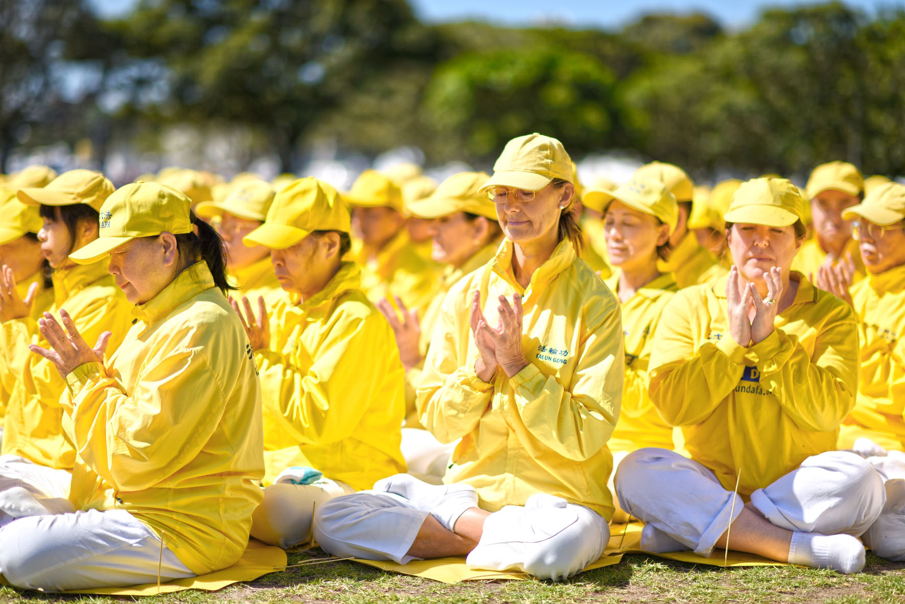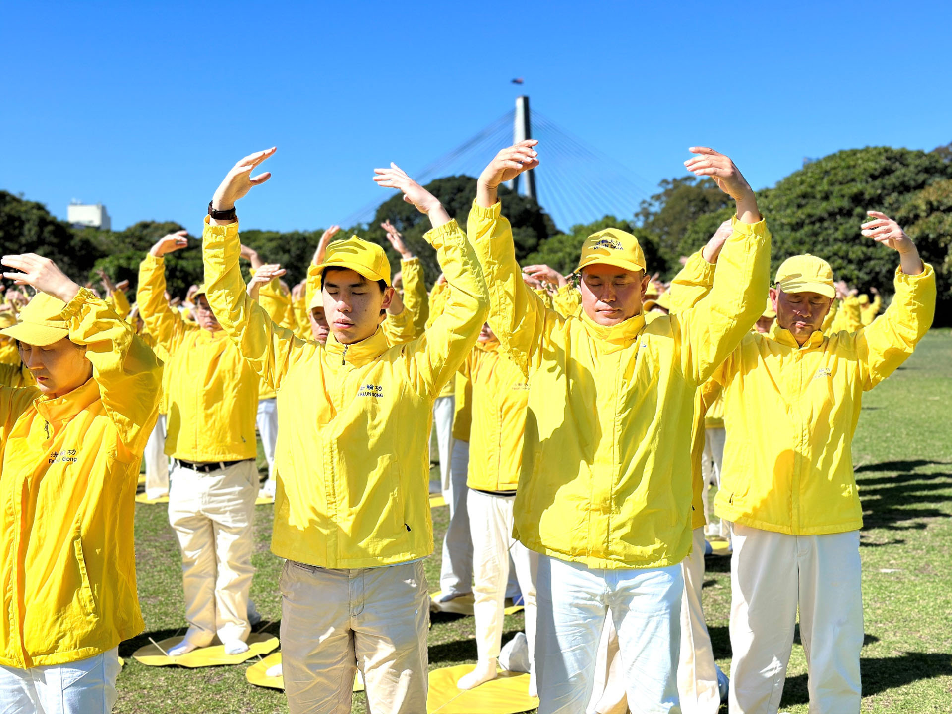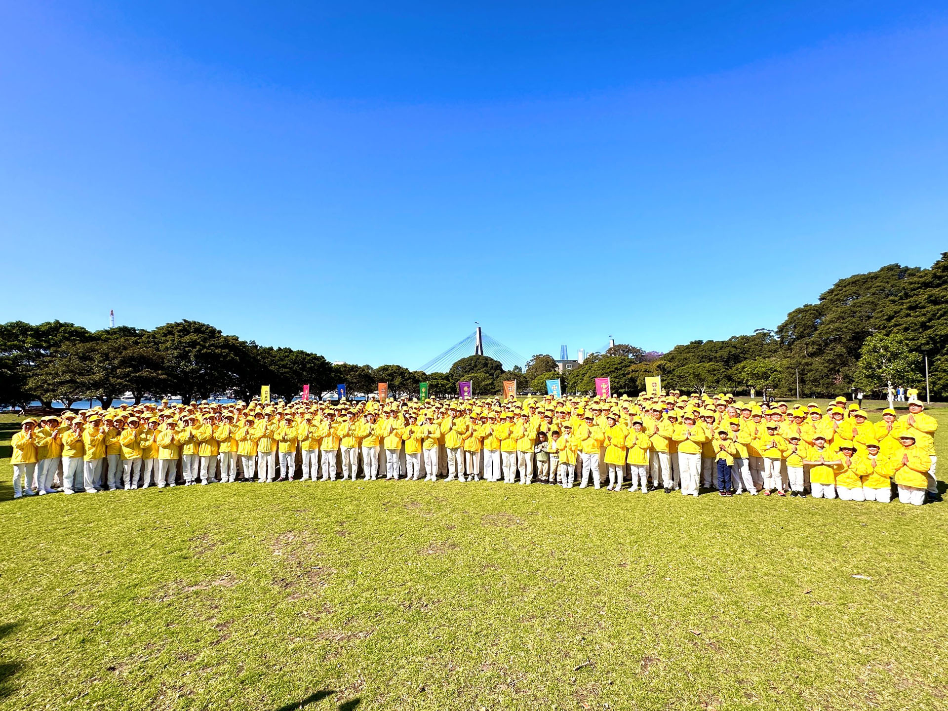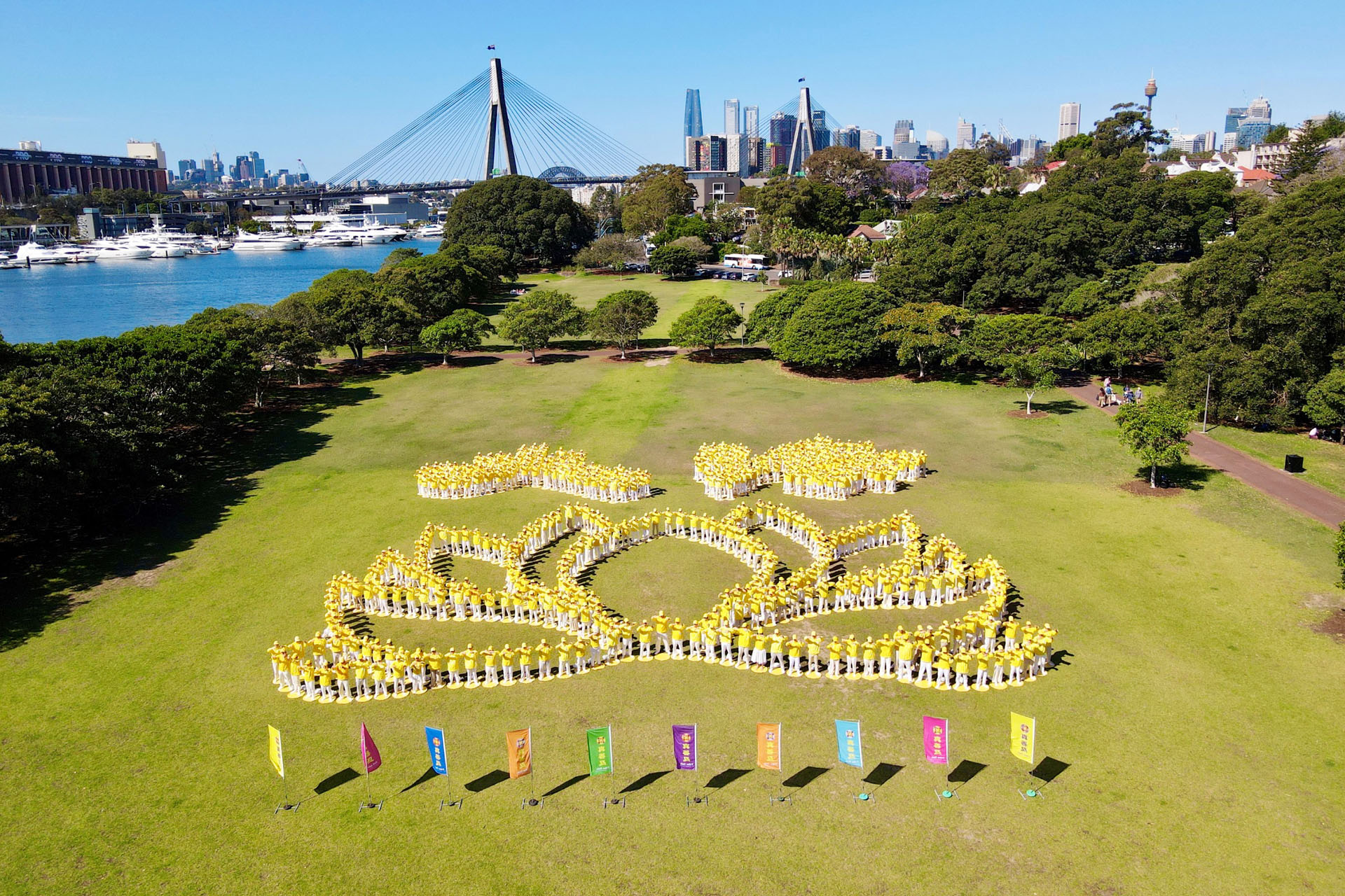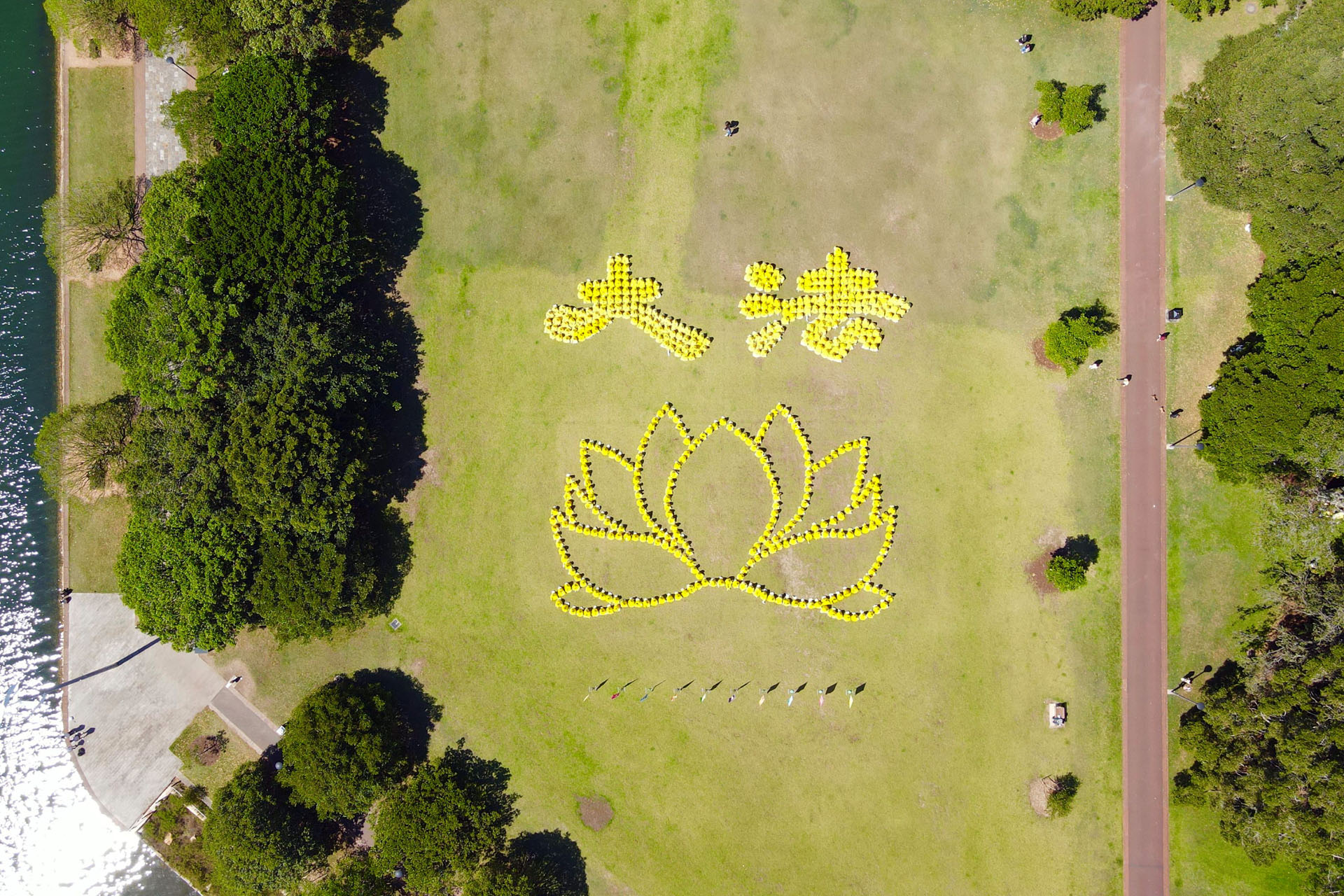 二零二四年十月二十六日,在悉尼市中心的银禧水滨公园,来自澳洲各地的部分法轮功学员举行了排字、炼功活动,排出殊胜美好的“大法”二字和莲花图形。